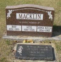 Anna Bella Grigg was born in 1884; Date 1884 per Memorial. per GEDCOM of Nick Vanderknokke, April 29 2015.1,2,3 As of 14 September 1904,her married name was Macklin.1 She married Roy Davidson Macklin, son of Thomas Robert Macklin and Mary Jane Davidson, on 14 September 1904 at Alnwick Twp., Roseneath, Northumberland Co., Ontario; per GEDCOM of Nick Vanderknokke, April 29 2015.1 Anna Bella Grigg was buried in 1965 at City of Grande Prairie Cemetery, Grande Prairie, Alberta; Memorial: (See Exhibit) MACKLIN; Roy; 1881 - 1970; Neil; 1919 - 1929; Anna Bella; 1884 - 1965 (City of Grande Prairie Cemetery, Grande Prairie, image per family tree of lindal22 on ancestry.ca, Oct 6 2018.)2,3 She died in 1965 at Grande Prairie, Alberta; Date 1965 per Memorial.3