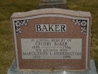 Crosby Baker was born in 1898; Date 1898 per Memorial.1 He married Lina Marguerite Herrington, daughter of Charles Earnest Herrington and Ethel Elizabeth Ellinor Kemp, circa 1930; per Memorial.1 Crosby Baker was buried in 1986 at Greenwood Cemetery, Smithfield, Northumberland Co., Ontario; Memorial: (See Exhibit) BAKER; In Loving Memory of; Crosby Baker; 1898 - 1986; His Beloved Wife; Marguerite L. Herrington; 1909 - 1999 (Greenwood Cemetery, Smithfield.)1 He died in 1986; Date 1986 per Memorial.1