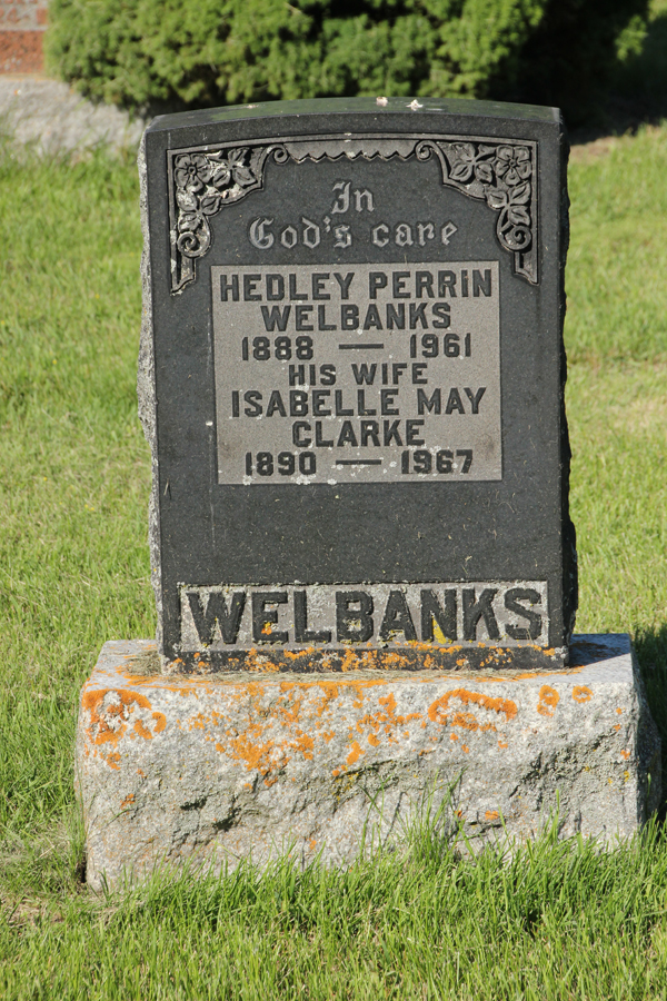 Hedley Perrin Welbanks was born on 1 August 1888 at South Marysburgh Twp., Prince Edward Co., Ontario; Date 1888 per Memorial. Date 1888 & location Ont. per 1921 Census. Date Aug 1 1888 & location Ont. rural per 1901 Census. Date 1888 & location Ont. per 1891 Census. Date 1888 per marr. reg'n. Date Aug 1 1888 per GEDCOM of Peter Rogers, May 4 2016.1,2,3,4,5,6 He appeared on the census of April 1891 at South Marysburgh Twp., Prince Edward Co., Ontario; Age 3 at 1891 Census: see John James Welbanks.2 He appeared on the census of 16 April 1901 at South Marysburgh Twp., Prince Edward Co., Ontario; Age 12 at 1901 Census: see John James Welbanks.6 He lived on 21 August 1909 at South Marysburgh Twp., Prince Edward Co., Ontario; Residence South Marysburgh per marr. reg'n.3 He married Isabella May "Belle" Clark, daughter of Andrew Minaker Clark and Sophia White Sweetman, on 21 August 1909 at South Marysburgh Twp., Milford, Prince Edward Co., Ontario; Marriage Reg'n.#017761: Groom: Hedley Perrin Welbanks; Age: 21; res; South Marysburgh; Status; bachelor; Occ.: farmer; Rel.: Meth; Parents: John Welbanks, farmer & Mary Warring; Bride: Isabel May Clark; Age: 19; Res.: South Bay; Status: spinster; Rel.: Meth; Parents: Andrew M. Clark, farmer & Sophia Sweetman; Wit.: Walter Clapp, Milford & Bessie Rose, South Bay; Date: Aug 21 1909; Place: Milford; Performed by: Rev. Alfred L. Brown, Milford; Reg'd.: Aug 27 1909; Reg'r.: Harvey F. Grimmson, South Marysburgh Twp. (Ontario Marriage Registraiton, #017761-1909, ancestry.com) Date Aug 21 1909 & location Milford per GEDCOM of Peter Rogers, May 4 2016.1,7 Hedley Perrin Welbanks appeared on the census of 1921 at Kylehouse Apt., Front St., Belleville, Hastings West Co., Ontario; Age 33 at 1921 Census: Welbanks, Hedley, 33, b. Ont., p.b. Ont., Irish, Meth., Doctor, married; Isabella, 31, b. Ont., p.b. Ont., Irish, Meth., married; Beatrice, 11; June, 6 (1921 Census: Belleville, Hastings West Co., dist. 90, sub-dist. 30, pg. 6, line 26 - Kylehouse Apartements, Front St. - ancestry.com.)4 He lived in 1945 at 190 James St., Belleville, Hastings Co., Ontario; "190 Welbanks, Hedley, Dr. V. S. ... 115" and "190 Welbanks, Mrs. Hedley ... 116" Canada Voters List, Belleville, 1945, pg. 78 of 175, ancestry.com.8 He died in 1961 at Ontario; Date 1961 per Memorial. Date 1961 per GEDCOM of Peter Rogers, May 4 2016.1,5 He was buried in 1961 at Cherry Valley Cemetery, Cherry Valley, Prince Edward Co., Ontario; Memorial: (See Exhibit) Hedley Perrin; Welbanks; 1888 - 1961; His Wife; Isabelle May; Clarke; 1890 - 1967 (Cherry Valley Cemetery, Prince Edward Co., image copied from www.findagrave.com May 4 2016.)5