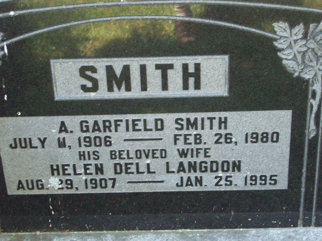 CemSearch: Name: A. Garfield Smith; Born: Jul 11 1906; Died: Feb 26 1980; ID: MTHOPE974; Other names: Smith, Helen Dell [Langdon] (1907- ); Cemetery: Mount Hope Cemetery, Conc A, Lot 35, Brighton Twp., Brighton Village, Northumberland Co., SEC 3 Row 18; Note: Husband of Helen Dell Langdon. (https://www.cemsearch.ca/burial/?pid=MTHOPE974%5E0.)1,4