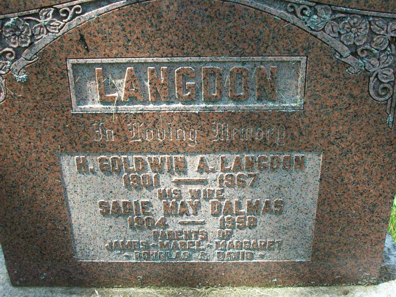 Sadie May Dalmas was born on 10 March 1904 at Murray Twp., Northumberland Co., Ontario; Date 1904 per Memorial. Date Mar 10 1904 & location Murray per family tree of swijan on ancestry.ca, July 5 2019.1,2 As of 11 October 1930,her married name was Langdon.1 She married Hans "Goldwin" Albert Langdon, son of Goldwin "Smith" Langdon and Margaret Emma "Maggie" Smith, on 11 October 1930 at Ontario; Date Oct 11 1930 per family tree of swijan on ancestry.ca, July 5 2019. per Memorial.1,2 Sadie May Dalmas lived in 1945 at Brighton, Northumberland Co., Ontario; "106 Langdon, Smith, gentelman, Brighton" & "107 Langdon, Mrs. Smith - Brighton" & "108 Langdon, Goldwyn, mail man, Brighton" & "109 Langdon, Mrs. Goldwyn - Brighton" Canada Voters Lists, 1945, Northumberland Co., Village of Brighton, Polling Div. No. 21, pg. 74 of 178, ancestry.ca.3 She died on 7 September 1958 at Brighton, Northumberland Co., Ontario, at age 54; Date 1958 per Memorial. Date Sep 7 1958 & location Brighton per family tree of swijan on ancestry.ca, July 5 2019.1,2 She was buried on 9 September 1958 at Wooler Friends Cemetery, Brighton Twp., Northumberland Co., Ontario; Memorial: (See Exhibit) LANGDON; In Loving Memory; H. Goldwin A. Langdon; 1901 - 1967; His Wife; Sadie May Dalmas; 1904 - 1958; Parents of; James, Mabel, Margaret, Douglas, David (Wooler Friends Cemetery, Brighton Twp., Jul 17 2009.)1