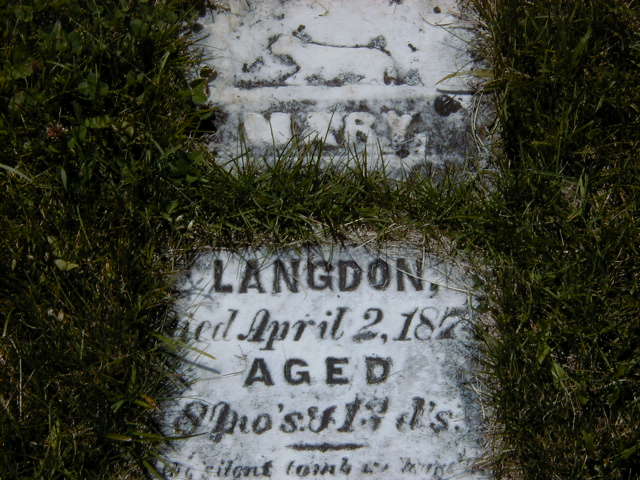 Mary Langdon was born on 20 July 1873 at Brighton Twp., Northumberland Co., Ontario; Date Jul 20 1873 per Memorial - age 8m 13d at death Apr 2 1874. Guessing Mary is dau. of Hannibal???1 She died on 2 April 1874 at Brighton Twp., Northumberland Co., Ontario; Date Apr 2 1874 per Memorial.1 She was buried on 4 April 1874 at Waite's Cemetery, Cramahe Twp., Northumberland Co., Ontario; Memorial: (See Exhibit) Mary; Daughter of; ---- ; Langdon; Died April 2, 1874; Aged; 8 Mo's & 13 d's (Waite's Cemetery, Cramahe Twp., Jul 3 2004)(Note: The stone is broken and grass is growing in the crack right where the name would be. I am guessing that Mary was a daughter of Hannibal Langdon - seems to only one having kids at that time. is this correct?1