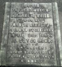 Elizabeth White was born in October 1819 at Hamilton Twp., Northumberland Co., Upper Canada; Date Oct 1819 & location Cobourg per Memorial - age 25y 6m at death Apr 23 1845. Date Nov 1819 & location Hamilton Twp. per family tree of banninge on ancestry.com, Aug 3, 2016.1,2 She was baptized on 23 March 1823 at St. Peter's Anglican Church, Cobourg, Northumberland Co., Upper Canada; Baptism: Name: Elizabeth White; Date of Baptism: Mar 23 1823; Parents: Josiah & Catherine White (St. Peter's Church, Cobourg (St. Peter's Church Parish Register, per family tree of Bill Smith on ancestry.ca, Oct 19 2020.)1 As of 12 March 1841,her married name was Burnet.1 She married Francis "Frank" Burnet Jr., son of Francis Burnet Sr. and Margaret Dodds, on 12 March 1841 at Cobourg, Northumberland Co., Canada West; Marriage Register: Groom: Francis Burnett; Bride: Eliz. White; DatE: March 12 1841; Wit: Josiah White & H. Smith; by Banns (Ontario Marriage Registers, Newcastle, 1841, pg. 3 of 19, right page, bottom first section, ancestry.ca) per family tree of banninge on ancestry.com, Aug 3, 2016.1,3 Elizabeth White died on 23 April 1845 at Cobourg, Nortbumberland Co., Canada West, at age 25; Date April 23, 1845 & location Coborug per Memorial. Date Apr 18 1845 & location Cobourg per family tree of banninge on ancestry.com, Aug 3, 2016.1,2 She was buried on 25 April 1845 at Old Kirk Cemetery, Cobourg, Northumberland Co., Canada West; Memorial: (See Exhibit) Sacred; To The Memory of; Elizabeth White; Wife of; Francis Burnet Jr; Who Died at Cobourg; April 23, 1845; AE. 25 Y'Rs & 6 Mo; Also; Catherine; Infant Daughter of; Francis & Elizabeth; Burnet (Old Kirk Cemetery, rear of St. Paul's Lutheran Church, 388 William St., Cobourg, Aug 17 2016.)2