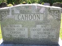 Nelson Corey Cahoon was born on 12 October 1904 at Bloomfield, Prince Edward Co., Ontario; Date 1904 per Memorial. Date Oct 12 1904 & location Bloomfield, Prince Edward Co. per Reagan Blakmore Family Tree on ancecstry.com, Dec 4 2016.1,2 He married Fannie Dorothy Solomon, daughter of George Drewry Solomon and Lizzie Winterborn, on 16 July 1929 at U.S.A; per Reagan Blakmore Family Tree on ancecstry.com, Dec 4 2016.1 Nelson Corey Cahoon died on 10 May 1982 at Glenview, Cook Co., Illinois, U.S.A., at age 77; Date 1982 per Memorial. Date May 10 1982 & location Glenview, Cook Co., Illinois per Reagan Blakmore Family Tree on ancecstry.com, Dec 4 2016.1,2 He was buried on 15 May 1982 at Mount Hope Cemetery, Brighton, Northumberland Co., Ontario; Memorial: (See Exhibit) CAHOON; Husband; Nelson Corey; Cahoon; 1904 - 1982; Wife; Fannie Dorothy; Solomon; 1903 - 1979 (Mount Hope Cemeetery, Brighton, June 5 2009.)2