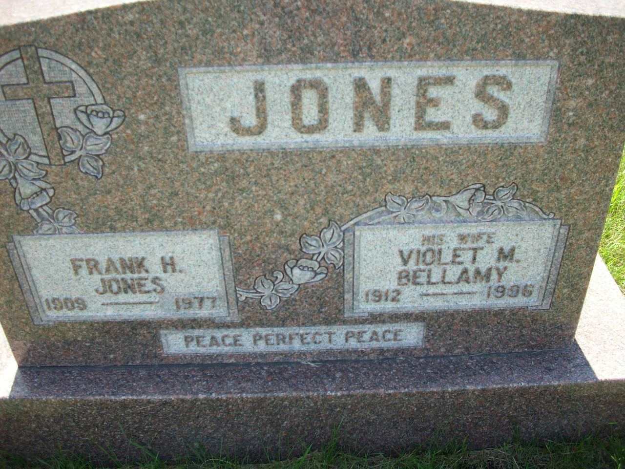 Frank Henry Jones was born on 21 July 1909 at Cramahe Twp., Northumberland Co., Ontario; Date 1909 per Memorial. per Death Notice of Kenneth Charles Bellamy. Date 1910 & location Ont. per 1921 Census. Date 1910 & location Ont. per 1911 Census. Date Jul 21 1909 & location Cramahe Twp. per family tree of Kimberley Mills Rumball on ancestry.ca, Sep 24 2020.1,2,3,4 He appeared on the census of 1911 at Cramahe Twp., East Northumberland Co., Ontario; Age 1 at 1911 Census: see Harry L. Jones.3 He appeared on the census of 11 June 1921 at Cramahe Twp., Northumberland Co., Ontario; Age 11 at 1921 Census: see Harry Jones.4 He married Violet May Bellamy, daughter of Charles Bellamy and Olive A. Bland, on 9 April 1930 at Ontario; Date Apr 9 1930 per family tree of Kimberley Mills Rumball on ancestry.ca, Sep 24 2020. per Death Notice of Kenneth Charles Bellamy.2 Frank Henry Jones died on 6 March 1977 at Colborne, Northumberland Co., Ontario, at age 67; Date 1977 per Memorial. per Death Notice of Kenneth Charles Bellamy. Date Mar 6 1977 & location Colborne per family tree of Kimberley Mills Rumball on ancestry.ca, Sep 24 2020.1,2 He was buried on 9 March 1977 at Castleton Cemetery, Castleton, Northumberland Co., Ontario; Memorial: (See Exhibit) JONES; Frank H; Jones; 1909 - 1977; His Wife; Violet M; Bellamy; 1912 - 1996 (Castleton Cemetery, Castleton, Jul 13 2009.)1