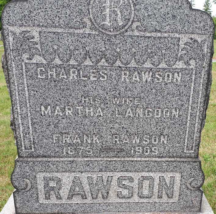 Frank Rawson was born in 1875 at Northumberland Co., Ontario; Date 1875 per Memorial. Date 1875 & location Ont. per 1881 Census.1,2 He appeared on the census of April 1881 at Brighton Twp., Northumberland East Co., Ontario; Age 6 at 1881 Census: see Charles Rawson.1 He was buried in 1909 at Waite's Cemetery, Cramahe Twp., Northumberland Co., Ontario; Memorial: (see Exhibit) Charles Rawson; --- ; His Wife; Martha Langdon; --- ; Frank Rawson; 1875 - 1909; RAWSON (Waite Cemetery, Cramae Twp., Aug 2 2018.)2 He died in 1909; Date 1909 per Memorial.2