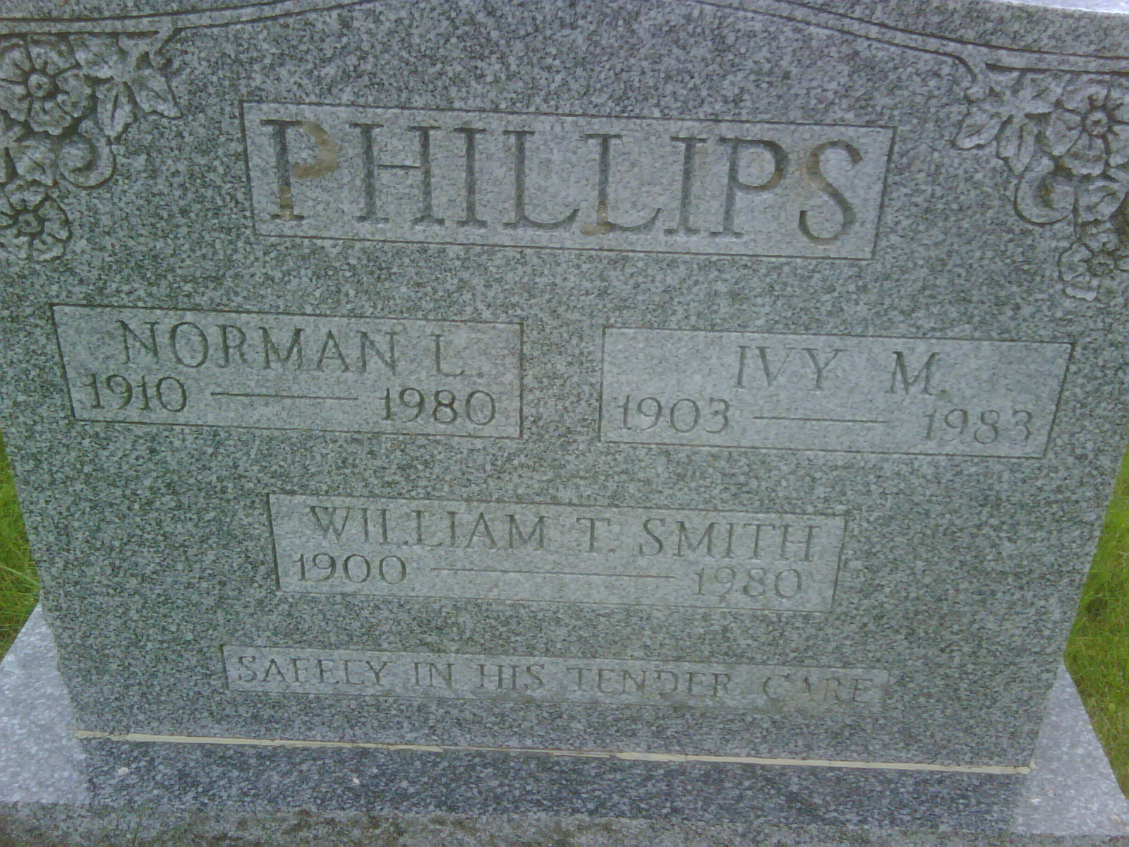 William T. Smith was born in 1900; Date 1900 per Memorial. (Assuming this is a brother of Ivy Matilda (Smith) Phillips.1 He was buried in 1980 at Cramahe Hill Cemetery, Morganston, Northumberland Co., Ontario; Memoirial: (See Exhibit) PHILLIPS; Norman L; 1910 - 1980; Ivy M; 1903 - 1983; William T. Smith; 1900 - 1980 (Cramahe Hill Cemetery, Cramahe Twp., July 15 2009) (Assuming William T. Smith is a brother of Ivy Matilda (Smith) Phillips.)1 He died in 1980; Date 1980 per Memorial.1