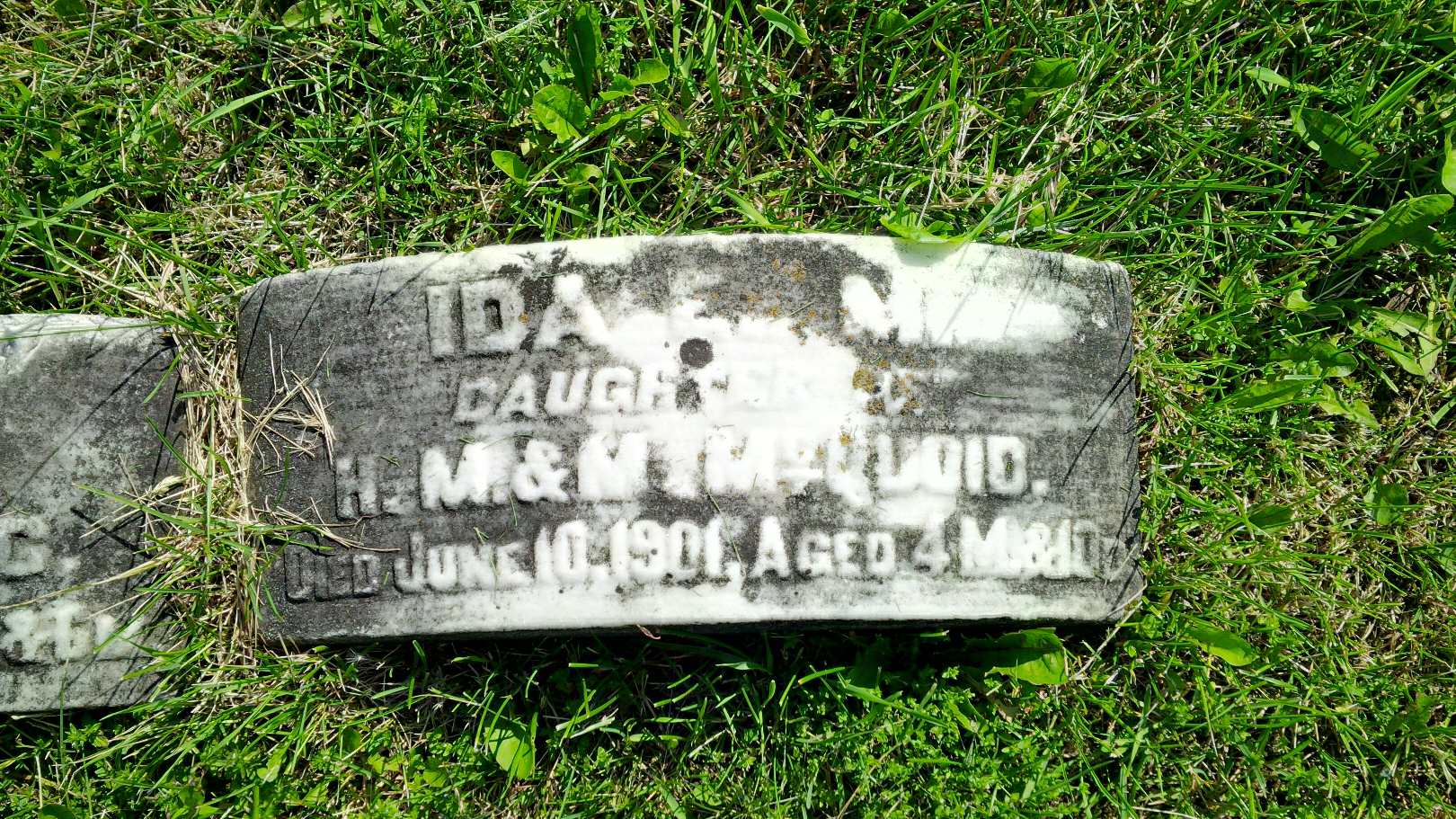 Ida Edna May McQuoid was born on 29 January 1901 at Iroquois, Dundas Co., Ontario; per family tree of gjtack on ancestry.ca, May 31 2017.1 She died on 10 June 1901 at Brighton, Northumberland Co., Ontario; per family tree of gjtack on ancestry.ca, May 31 2017.1 She was buried on 12 June 1901 at Mount Hope Cemetery, Brighton, Northumberland Co., Ontario; Memorial: (See Exhibit) Ida E. May; Daughter of; H. M. & M. McQuoid; Died June 10, 1901, Aged 4 M. & 6Ds (Mount Hope Cemetery, Brighton, May 30 2017.)2