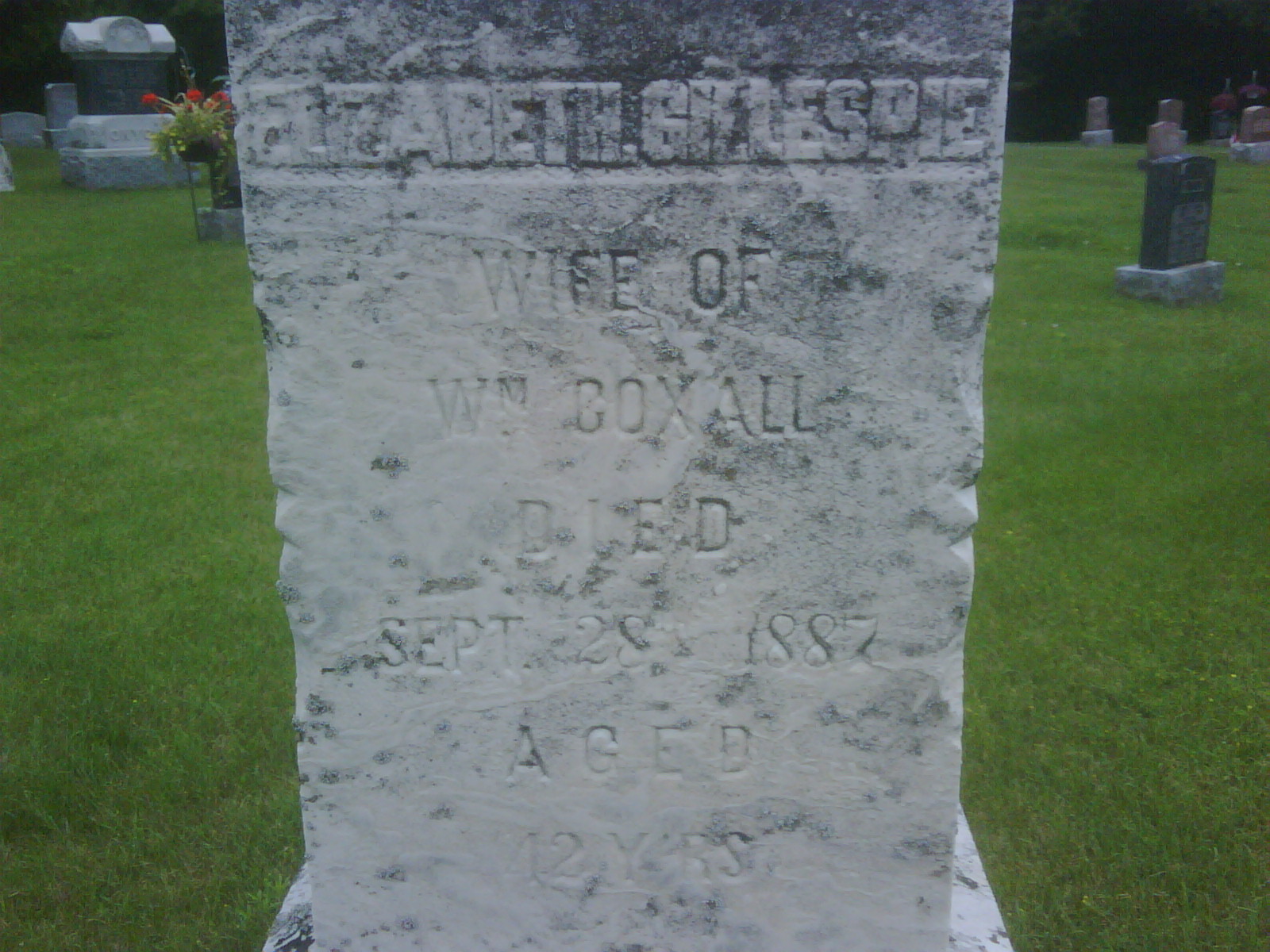 Elizabeth Gillespie was born on 26 August 1845 at Wolfe Island, Northumberland Co., Ontario; Date 1845 per Memorial. Date 1848 & location Ont. per 1881 Census. Date 1848 & location Ont. per 1871 Census. Date Aug 26 1845 & location Wolfe Island per family tree of LaurBrooks on ancestry.ca, Aug 6 2017.1,2,3,4 She married William Coxall, son of Lawrence John Coxall and Frances Amelia L. Darby, on 13 November 1865 at Trinity Anglican Church, Wolfe Island, Frontenac Co., Canada West; per family tree of LaurBrooks on ancestry.ca, Aug 6 2017.1 As of 13 November 1865,her married name was Coxall.1 Elizabeth Gillespie appeared on the census of April 1871 at Wolfe Island, Frontenac Co., Ontario; Age 23 at 1871 Census: see William Coxall.3 She appeared on the census of April 1881 at Colborne, Northumberland East Co., Ontario; Age 33 at 1881 Census: see William Coxall.2 She died on 28 September 1887 at Colborne, Northumberland Co., Ontario, at age 42; per family tree of LaurBrooks on ancestry.ca, Aug 6 2017.1 She was buried on 30 September 1887 at Salem Cemetery, Cramahe Twp., Salem, Northumberland Co., Ontario; Memorial: (See Exhibit) Elizabeth Gillespie; Wife of; Wm. Coxall; Died; Sept. 28, 1887; Aged; 42 Y'rs (Salem Cemetery, Cramahe Twp., July 6 2009.)4