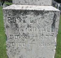 Robert Lawrence Walter Coxall was born on 6 January 1877 at Colborne, Northumberland Co., Ontario; Date 1877 per Memorial. Date Jan 6 1877 & location Ont. urban per 1901 Census. Date 1877 & location Ont. per 1881 Census. Date 1876 & location Colborne per marr. reg'n. per family tree of LaurBrooks on ancestry.ca, Aug 6 2017.1,2,3,4,6 He appeared on the census of April 1881 at Colborne, Northumberland East Co., Ontario; Age 4 at 1881 Census: see William Coxall.2 He married Emma M. Cornwell, daughter of Vincent G. Cornwell and M. Robinson, on 20 June 1900 at Colborne, Northumberland Co., Ontario; Marriage Reg'n.# : Groom: R. L. W. Coxall; Age: 24; res. & Born: Colborne; Status: bachelor; Occ.: Merchant; Parents: Wm. Coxall & E. Gillespie; Bride: Emma M. Cornwell; Age: 24; Res. & Born: Colborne; Status: spinster; Parents: V. G. Cornwell & M. Robinson; Wit.: A. H. Griffis, Colborne & Alice Cornwell, Colborne; Date: Jun 20 1900; Place: Colborne; Rel.: Episc; Performed by: Rev. G. H. Webb; Reg'd.: Jun 21 1900 (Ontario Marriage Registration, #011692-1900, ancestry.ca.)7 Robert Lawrence Walter Coxall appeared on the census of 4 April 1901 at Colborne, Northumberland East Co., Ontario; Age 24 at 1901 Census: Coxall, Robert, 24, b. Ont. u. Jan 6 1877, Eng., CE, dry goods merchant, married; Emma M., 23, b. Ont. u. Apr 22 1877, Eng., CE, married; Cornwell, Vincent, 49, b. England, Eng., CE, tailor, father-in-law, widower; Alice B., 20, b. Ont. u. Jun 14 1880, Eng., CE, daughter (1901 Census: Colborne, Northumberland East Co., dist. 95, sub-dist. d-1, pg. 2, line 47 - ancestry.ca.)6 He lived circa 1910 at King Street, Colborne, Northumberland Co., Ontario; "Robert Lawrence Coxall (1877-1916) was a dry goods merchant as per the 1901 census. He was born in Colborne and lived there his entire life, dying of a cerebral hemorrhage in 1916. He lived for a time in Seaton House on King Street. He married Emma May Cornwell (1878-?) in 1900. No reference has been found to children." from Heritage Cramahe, Website by John Charlton, https://heritagecramahe.ca/coxall-family/. He died on 11 June 1916 at Colborne, Northumberland Co., Ontario, at age 39; Death Reg'n.#024237: Name: Robert Lawrence Walter Coxall; Date: Jun 11 1916; Age: 39; Res.: Colborne; Occ.: Merchant; Parents: William Coxall & ? Gillespie; Cause: cerebral hemorrhage, 15 hrs; Phys.: J. Archer Brown; Inf.: V. G. Cornwell. Colborne; Reg'd.: Jun 12 1916; Reg'r.: H. S. Keyes (Ontario Death Registration, #024237-1916, ancestry.ca) Date 1916 per Memorial. Date 1916 per family tree of LaurBrooks on ancestry.ca, Aug 6 2017.