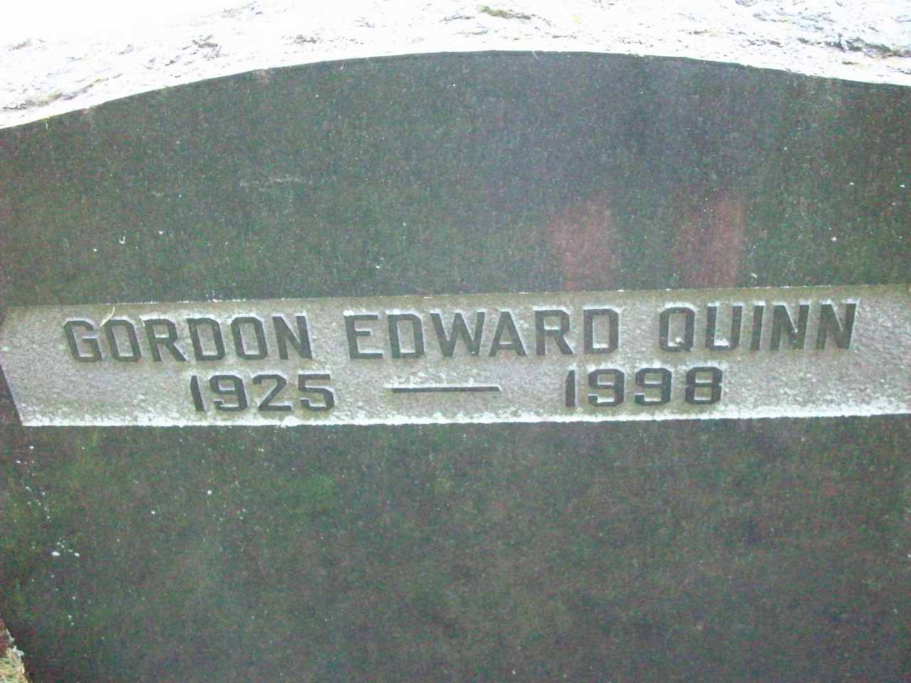 Gordon Edward Quinn was born in 1925; Date 1925 per Memorial.1 He was buried in 1998 at Castleton Cemetery, Castleton, Northumberland Co., Ontario; Memorial: (See Exhibit) Gordon Edward Quinn; 1925 - 1998 (Castleton Cemetery, Castleton, July 15 2009)(Back of Black stone, Charles on Front - Gordon is son.)1 He died in 1998; Date 1998 per Memorial.1