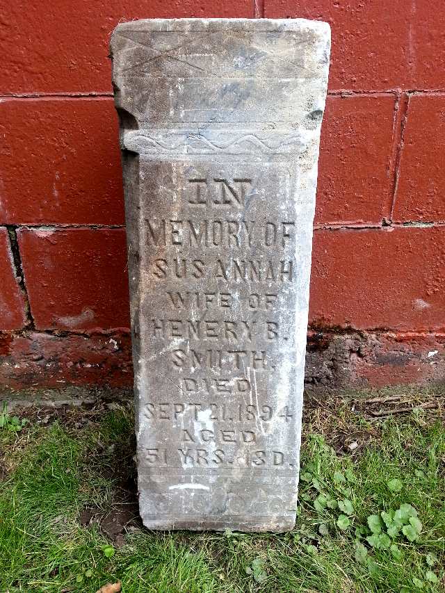 Susannah Morrison was born on 3 September 1843 at Sidney Twp., Hastings Co., Canada West; Date Sep 3 1843 per Memorial - age 51y 18d at death Sep 21 1894. Date 1844 & location Ont. per 1891 Census. Date 1843? & location Ont. per 1881 Census. Date 1843 & location Sidney per 1851 Census. per family tree of margarethmadden on ancestry.ca, Aug 24 2017.1,2,3,4,6 She appeared on the census of 1851 at Sidney Twp., Hastings Co., Canada West; Age 8 at 1851 Census: see James Morrison.4 As of circa 1863,her married name was Smith.1 She married Henry Brunson Smith, son of Samuel Rose Smith and Elizabeth "Betsy" Lott, circa 1863 at Canada West; per family tree of margarethmadden on ancestry.ca, Aug 24 2017.1 Susannah Morrison appeared on the census of April 1881 at Sidney Twp., Hastings West Co., Ontario; Age 38? at 1881 Census: see Henry Smith.3 She appeared on the census of April 1891 at Sidney Twp., Hastings West Co., Ontario; Age 47 at 1891 Census: see Henry Smith.2 She died on 21 September 1894 at Frankford, Hastings Co., Ontario, at age 51; Date Sep 21 1894 per Memorial. Henry Bronson Smith is a widower per 1901 Census.7,6 She was buried on 23 September 1894 at Methodist Cemetery, Frankford, Hastings Co., Ontario; Memorial: (See Exhibit) In; Memory of; Susannah; Wife of; Henery B; Smith; Died; Sept. 21, 1894; Aged; 51 Yrs. 18d Picture sent to me by Ron Waddling in August 2017, he took it at the back of 70 Yonge St., Brighton, which had been the Brigton Police Station for many years. New people moved in and found it buried on the north side of the house. It came from the Methodist Cemetery in Frankford, taken away as refuse since that church was sold in the 1920s with the union of the Methodist churches. The church building still stands at Victoria and Scott St., Frankford. Efforts will be made to repatriate this memorial. More to come on this.... (Dan Buchanan, Sep 3 2017.)8,6