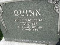 Arthur Quinn was born on 18 November 1888 at Cramahe Twp., Northumberland Co., Ontario; Date 1888 per Memorial. Date Nov 18 1888 & location Ont. rural per 1901 Census.1,2 He appeared on the census of 13 April 1901 at Cramahe Twp., Castleton, Northumberland East Co., Ontario; Age 12 at 1901 Census: see William Quinn.1 He married Alice May Teal, daughter of George Francis Teal and Mary Elizabeth Fraleigh, circa 1920; per Memorial.2 Arthur Quinn was buried in 1958 at Castleton Cemetery, Castleton, Northumberland Co., Ontario; Memorial: (see Exhibit) QUINN; Alice May Teal; 1889-1935; Wife of; Arthur Quinn; 1888-1958; Infants John E. and Douglas (Castleton Cemetery, Castleton, July 15 2009.)2 He died in 1958; Date 1958 per Memorial.2