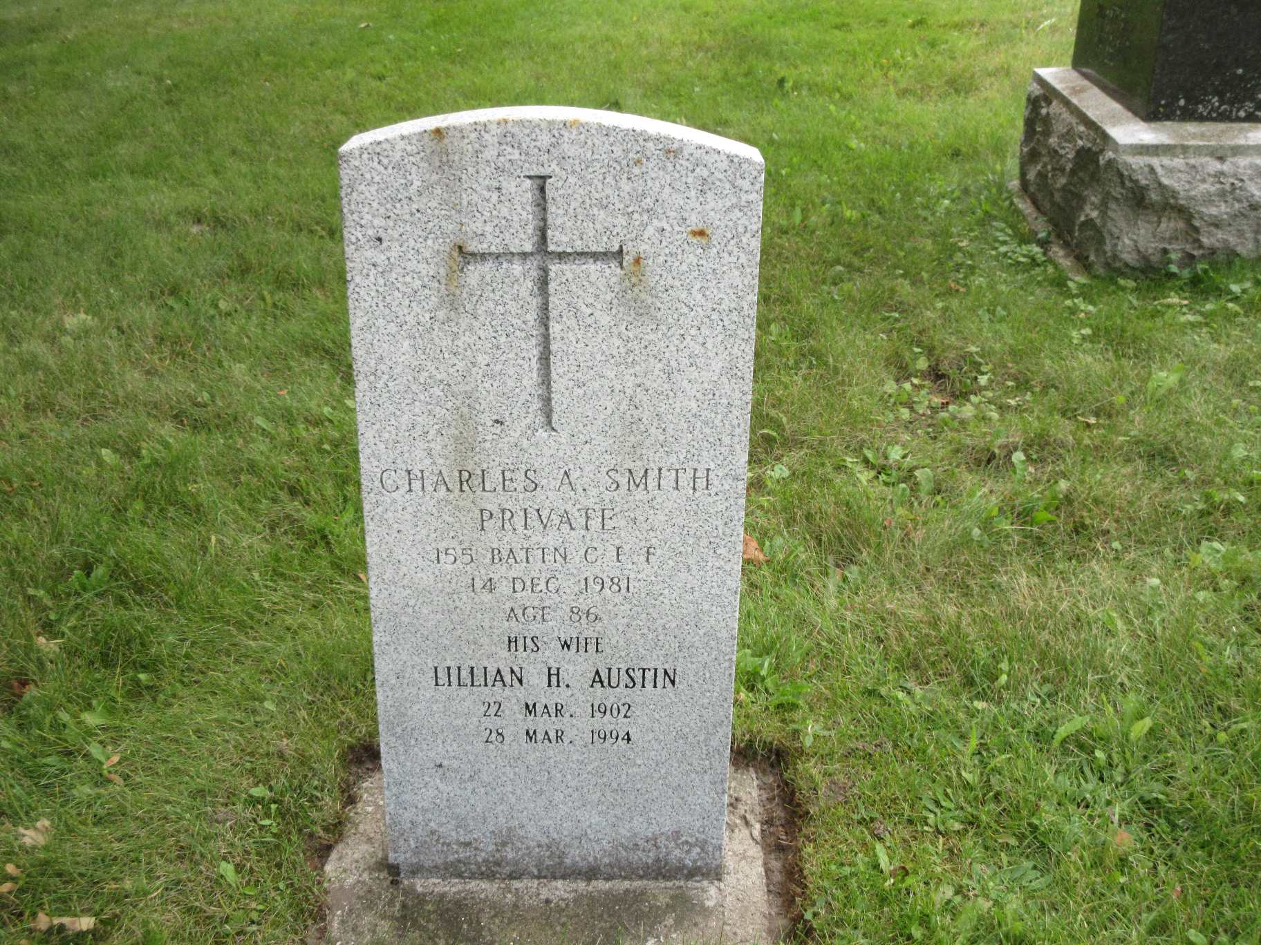 Charles Asel Smith was born on 14 February 1895 at Sidney Twp., Hastings Co., Ontario; Date 1895 per Memorial. Date Feb 1896 & location Ont. per 1911 Census. Date Feb 14 ?1895? & location Ont. rural per 1901 Census - year is not shown but age is 6.1,2,4 He appeared on the census of 19 April 1901 at Sidney Twp., Hastings West Co., Ontario; Age 6 at 1901 Census: see George E. Smith.1 He appeared on the census of September 1911 at Sidney Twp., Frankford, Hastings West Co., Ontario; Age 15 at 1911 Census: see George E. Smith.2 He lived on 29 June 1920 at Sidney Twp., Frankford P.O., Hastings Co., Ontario; Residence Frankford P.O. per marr. reg'n.3 He married Lillian Harriet Austin, daughter of William Kirkpatrick and Florence Sarah Neal, on 29 June 1920 at Trenton, Hastngs Co., Ontario; Marriage Reg'n.#014212: Groom: Charles Asel Smith; Age: 25; Res.: Frankford P.O; Born: Sidney Twp; Status; bachelor; Occ.: lab; Rel.: Meth; Parents: George Ezre Smith, b Hastings Co. & Mary Etta Chard; Bride: Lillian Harriett Austin; Age: 18; Res.: Sidney Tw; Born: England; Status: spinster; Occ.: servant girl; Rel.: CE; Parents: William Kirkpatrick, b. Scotland & Florence Sarah Neal; Wit.: Violet Doris Carter & Ernest Franklin Carter, Frankford; Date: Jun 29 1920; Place: Trenton; Performed by: F. W. Armstrong, Trenton, CE; Sworn: Frankford, Jun 29 1920; Reg'r.: Solomon Hadley Frankford (Ontario Marriage Registration, #014212-1920, ancestry.ca.)5 Charles Asel Smith died on 14 December 1981 at Ontario at age 86; Date Dec 14 1981 per Memorial.4 He was buried on 16 December 1981 at Holy Trinity Cemetery, Frankford, Hastings Co., Ontario; Memorial: (See Exhibit) Charles A. Smith; Private; 155 Battn. C.E.F; 14 Dec. 1981; Age 86; His Wife; Lillian H. Austin; 22 Mar. 1902; 28 Mar. 1994 (Holy Trinity Cemeetery, Frankford, Aug 28 2017.)4