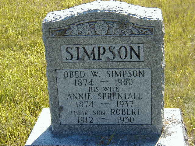 Robert James Simpson was born on 5 October 1912 at Conc B Lot 8, Brighton Twp., Nothumberland Co., Ontario; Birth Reg'n.#040929: Name: Robert Simpson; Date: Oct 5 1912; Place: Conc B, Lot ?8?; Parents: Obed Simpson & Annie Sprentall; Marr.: Coblorne, Dec 4 1895; Phys.: C.M. Sanford; Inf.: Obed Simpson, Brighton; Reg'r.: Fred O. Wade, Brighton Twp. (Ontario Birth Registration, #040929-1912, ancestry.ca) Date 1912 per Memorial. Date Oct 5 1912 & location Brighton Twp. per Death Reg'n.1,2,3 He died on 3 April 1930 at Conc 1 Lot 12, Brighton Twp., Northumberland Co., Ontario, at age 17; Death Reg'n.#025452: Name: Robert James Simpson; Date: Apr 3 1930; Age: 17y 6m; Res.: Conc 1, Lot 12, Brighton Twp., 8y; Born: Brighton Twp., Oct 5 1912; Nat.: Eng; Status: single; Occ.: farm lab; Parents: Obediah W. Simpson, b. Brighton Twp. & Annie Sprentall, b. Cramahe Twp; Inf.: Obed W. Simpson, RR# 6, Brighton Twp., father; Burial: Woods Cemetery, Apr 7 1930; Und.: B.E. Brintnell, Brighton; Reg'd.: Apr 7 1930; Reg'r.: Fred O. Wade, Brighton Twp. (Ontario Death Registration, #025452-1930, ancestry.ca) Date 1930 per Memorial.1,4 He was buried on 7 April 1930 at Woods Cemetery, Cramahe Twp., Northumberland Co., Ontario; Memorial: (See Exhibit) SIMPSON; Obed W. Simpson; 1874 - 1960; His Wife; Annie Sprentnall; 1874 - 1937; Their Son Robert; 1912 1920 (Woods Cemetery, Cramahe Twp., July 3, 2004) Date of Burial Apr 7 1930 & location Woods Cemetery per Death Reg'n.1,2