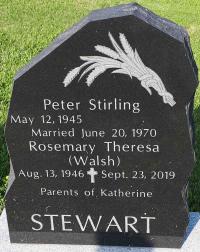 Rosemary Theresa Walsh was born on 13 August 1946; Date Aug 13 1946 per Memorial. per Obit of Stirling Peter Stewart.1 As of 20 June 1970,her married name was Stewart. She died on 23 September 2019 at Ontario at age 73; Date Sep 23 2019 per Memorial.1 She was buried on 26 September 2019 at Carman Cemetery, Brighton Twp., Carman, Northumberland Co., Ontario; Memorial: (see Exhibit) Peter Stirling; May 12, 1945 - ; Married June 20, 1970; Rosemary Theresa; (Walsh); Aug. 13, 1946 - Sept. 23, 2019; Parents of Katherine; STEWART (Carman Cemetery, Brighton Twp., image by Dan Buchanan, Aug 12 2023.)1