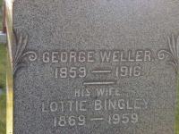 "Oct. 12, 1916, George Weller, [Deceased was a brother of Mrs. T. D. Sanford of this place.]" from pg. 037 of Newspaper Clippings, a collection donated by Shawnee Spencer to the Brighton Digital Archives, 2022.10,11,5 He was buried on 14 October 1916 at St. George's Cemetery, Trenton, Northumberland Co., Ontario; Memorial: (see Exhibit) George Weller; 1859 - 1916; His Wife; Lottie Bingley; 1869 - 1959 (St. George's Cemetery, Trenton, image by Dan Buchanan, Sep 24 2005)