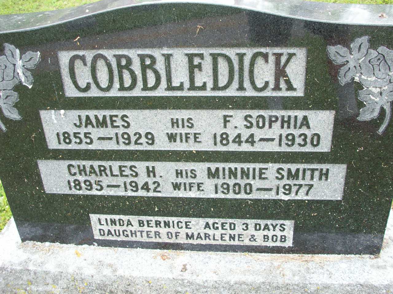 James Henry Cobbledick was born on 10 May 1855 at England; Date 1855 per Memorial. Date May 13 1855 & location England per CemSearch. Date 1856 & location England per 1921 Census. Date May 10 1857 & location England per 1901 Census. Location Seymour Twp. per per marr. reg'n. of son Thomas Raymond Cobbledick.1,5,6,3,4 He married Francis Sophia Rollo on 23 October 1889 at Seymour Twp., Northumberland Co., Ontario; Date Oct 23 1889 & location Seymour Twp. per family tree of Prenticelaurie on ancestry.ca, Nov 22 2017. per 1901 Census. per marr. reg'n. of son Thomas Raymond Cobbledick.1,6,2 James Henry Cobbledick appeared on the census of 12 April 1901 at Seymour Twp., East Northumberland Co., Ontario; Age 44 at 1901 Census: Cobbledick, James, 44, b. England May 10 1857, immig. 1882, Eng., Pres., farmer, married; Sophia, 45, b. Ont. r. Oct 23 1858, Scot., Pres., married; Jane, 11, b. Ont. r. Apr 1 1890, Eng., Pres., daughter; George, 9, b. Ont. r. Oct 24 1892, son; Charles, 7, b. Ont. r. Aug 20 1894, son; Thomas, 2, b. Ont. r. May 1 1899, son (1901 Census: Seymour Twp., East Northumberland Co., dist. 95, sub-dist. J-1, pg. 7, line 29 - ancestry.ca.)6 He appeared on the census of 6 June 1921 at Percy Twp., Northumberland Co., Ontario; Age 65 at 1921 Census: Cobbledick, James, 65, b. England, p.b. Eng., immig 1878, Eng.. Pres., farmer, married; Sophia L., 63, b. Scotland, p.b. Scot., immig. 1880, Scot., Pres., married; Charles H., 26, b. Ont., p.b. Eng. & Scot., Eng., Pres., farmer's son, single; Thomas R., 23, b. Ont., p.b. Eng. & Scot., Eng., Pres., farmer, married; Gertrude E., 19, b. Ont., p.b. Ont., Scot., Pres., daughter-in-law, married; Granville W., 2/12, b. Ont., p.b. Ont., Eng., Pres., grandson (1921 Census: Percy Twp., Northumberland Co., dist. 107, sub-dist. 36, pg. 3, line 24 - ancestry.ca.)5 He died on 28 May 1929 at Percy Twp., Northumberland Co., Ontario, at age 74; Date 1929 per Memorial. Date May 28 1929 & location Percy Twp. per CemSearch.3,4 He was buried on 30 May 1929 at Warkworth Cemetery, Warkworth, Northumberland Co., Ontario; Memorial: (See Exhibit) COBBLEDICK; James; 1855 - 1929; His Wife; F. Sophia; 1844 - 193; Charles H; 1895 - 1942; His Wife; Minnie Smith; 1900 - 1977; Linda Bernice aged 3years; Daughter of Marlene & Bob (Warkworth Cemetery, Warkworth, Jul 12 2009)