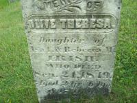 Olive Theresa Irish was born on 4 March 1847 at Cramahe Twp., Northumberland Co., Canada West; Date March 4 1847 per Memorial - age 2y 6m 17d at death Sep 21 1849.1 She died on 21 September 1849 at Cramahe Twp., Northumberland Co., Canada West, at age 2; Date Sep 21 1849 per Memorial.1 She was buried on 23 September 1849 at Salem Cemeter, Cramahe Twp., Salem, Northumberland Co., Canada West; Memorial: (See Exhibit) In Mdemory of; Olive Theresa; Daughter of; Asa F. & rebecca M; Irish; Who Died; Sep. 21, 1849; Aged 2 Yrs, 6 Mo; & 17 Days (Salem Cemetery, Cramahe Twp., July 6 2009.)1