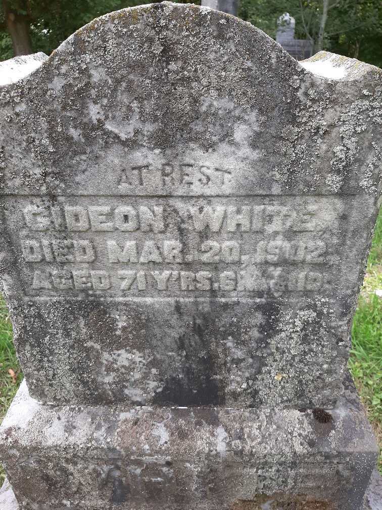 FindaGrave: Name: Gideon White; BIRTH: unknown; DEATH: 20 Mar 1902; BURIAL: Mount Carmel Cemetery, Northumberland County, Ontario, Canada; MEMORIAL ID: 215515515; Note: Inscription: Aged 71 Y'rs, 6 M. & 11 D's' (https://www.findagrave.com/memorial/215515515/gideon-white?_gl=1*1r90g27*_ga*MTM2OTMxODYxNS4xNjM1ODgwODE4*_ga_4QT8FMEX30*MTY3MTEzMDU0OC4zNDIuMS4xNjcxMTQ2ODc0LjUzLjAuMA..)
