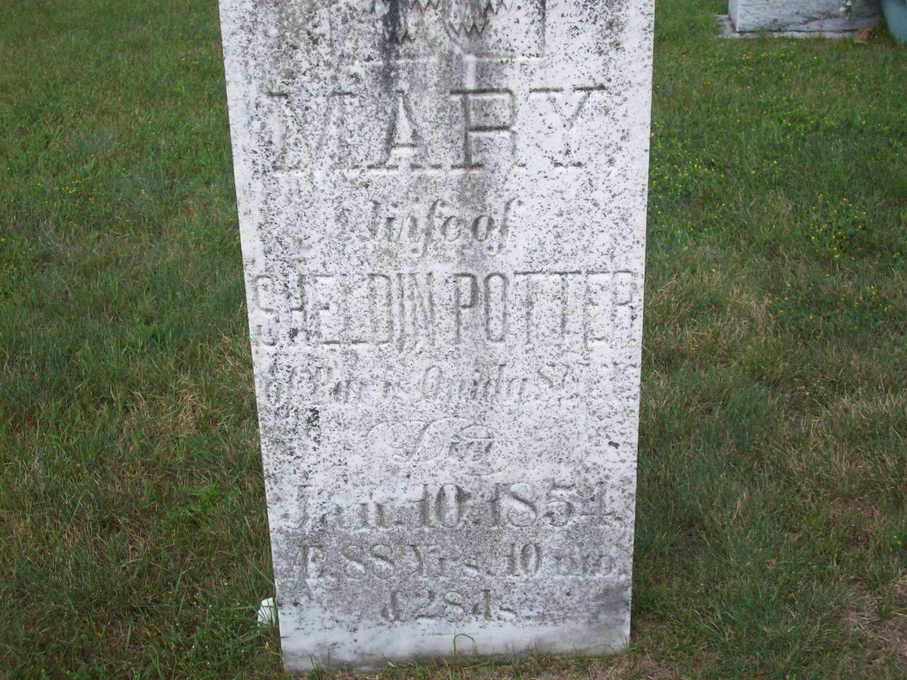 Mary Knowlton was born on 13 February 1765 at East Haddam, Middlesex Co., Connecticut, U.S.A; Date Feb 13 1765 per Memorial - age 88y 10m 28d at death Jan 10 1854. Date 1764 & location USA per 1851 Census. Date July 7 1749 & location East Haddam, Ct. per family tree of lisarocket22 on ancestry.ca, Apr 25 2018.1,2,3 She married Sheldon Potter, son of Phineas Potter and Dorcas Hinman, on 2 November 1786 at New Haven, New Haven Co., Connecticut, U.S.A; per 1851 Census. Date Nov 2 1786 & location New Haven, Ct. per family tree of lisarocket22 on ancestry.ca, Apr 25 2018.1,2 As of 2 November 1786,her married name was Potter.1 Mary Knowlton appeared on the census of 1852 at Cramahe Twp., Northumberland Co., Canada West; Age 87 at 1851 Census: see Cyrus Potter (son.)1 She died on 10 January 1854 at Lee, Oneida Co., New York, U.S.A., at age 88; Date Jan 10 1854 per Memorial. Mary, age 87, is in Brighton Twp. with son Cyrus Potter for 1851 Census. Date 1840 & location Lee, Oneida Co., NY per family tree of lisarocket22 on ancestry.ca, Apr 25 2018.1,2,3 She was buried on 12 January 1854 at Wood's Cemetery, Cramahe Twp., Northumberland Co., Canada West; Memorial: (See Exhibit) MARY; Wife of; Sheldin Potter; Of Paris?, Onida, ST of NY; Died; Jan. 10, 1854; AE 88 Yr's., 10 Mo; & 28 Ds (Wood's Cemetery, Cramahe Twp., July 6 2009.)3