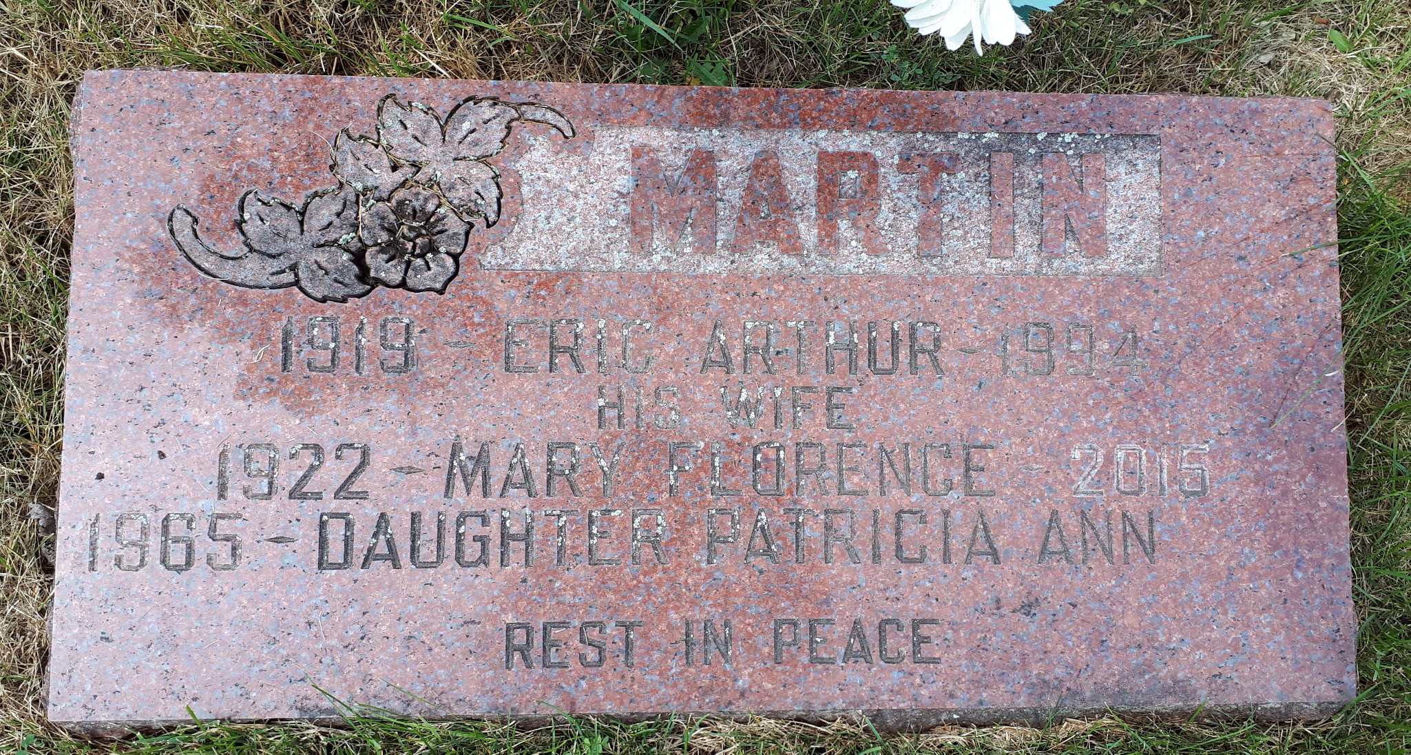Eric Arthur Martin was born on 7 November 1919; per family tree of hotmoma34 on ancestry.ca, Aug 12 2018.1 He married Mary Florence ? circa 1946; per Memorial.2 Eric Arthur Martin died on 11 September 1994 at Trenton, Hastings Co., Ontario, at age 74; per family tree of hotmoma34 on ancestry.ca, Aug 12 2018.1 He was buried on 14 September 1994 at Waite Cemetery, Cramahe Twp., Northumberland Co., Ontario; Memorial: (See Exhibit) MARTIN; 1919 - Eric Arthur Martin - 1994; His wife; 1922 - Mary Florence - 2015; 1965 - Daughter Patricia Ann (Waite Cemetery, Cramahe Twp., Aug 7 2018.)2