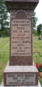 Maude Irene Murphy was born in 1902 at Brighton Twp., Northumberland Co., Ontario; Date 1902 per Memorial.1 She was buried in 1991 at Waite Cemetery, Cramahe Twp., Northumberland Co., Ontario; Memorial: (See Exhibit) In Memory of; John T. Murphy; Died; Aug. 19, 1870; Aged; 26 Y'rs. 1 Mo. & 7D; James L. Murphy; Died; Dec. 19, 1875; Aged; 25 Y'rs 6 Mo. & 17D; Maude Irene Murphy; 1902 - 1991; Dau. of; Adolphus and Bertha (Waite Cemetery, Cramahe Twp., Aug 7 2018.)1 She died in 1991; Date 1991 per Memorial.1