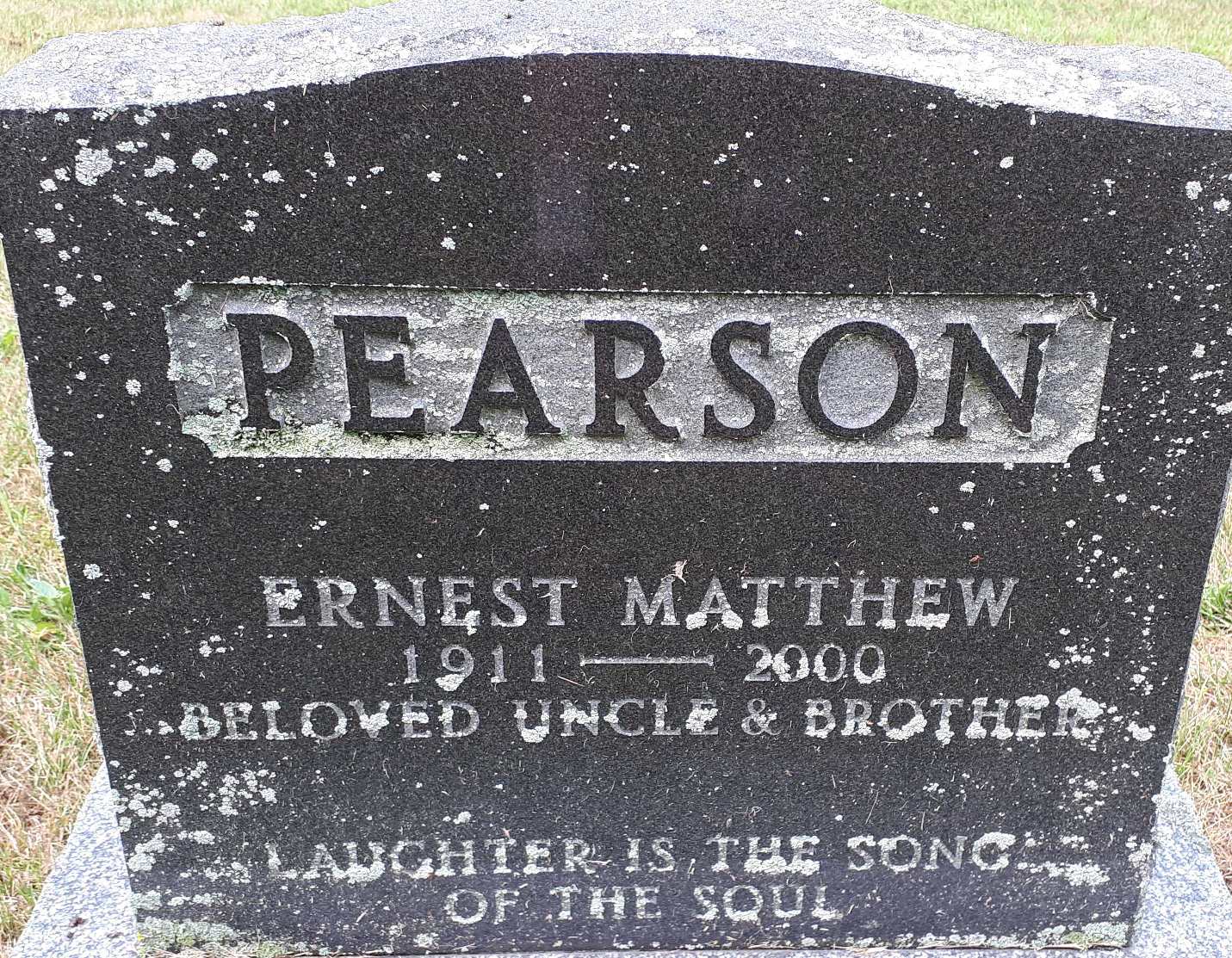 Ernest Matthew Pearson was born on 20 January 1911 at Cramahe Twp., Colborne, Northumberland Co., Ontario; per family tree of dougsly1 on ancestry.ca, Aug 14 2018.1 He died on 18 December 2000 at Ontario at age 89; per family tree of dougsly1 on ancestry.ca, Aug 14 2018.1 He was buried on 21 December 2000 at Waite Cemetery, Cramahe Twp., Northumberland Co., Ontario; Memorial: (See Exhibit) PEARSON; Ernest Matthew; 1911 - 2000; Belvoed Uncle & Brother (Waite Cemetery, Cramahe Twp., Aug 7 2018.)2