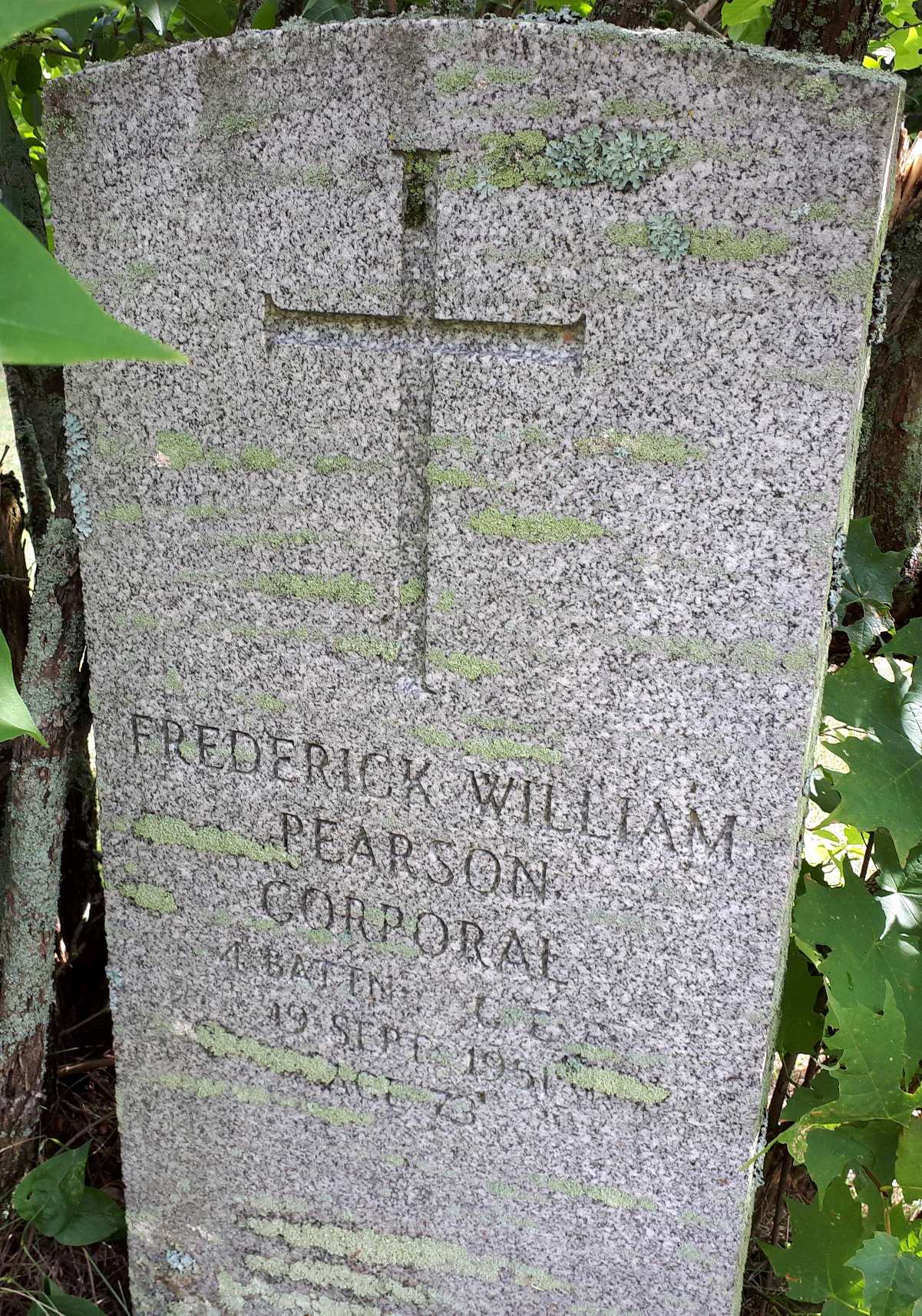 Frederick William Pearson was born on 21 May 1879 at London, England; per family tree of dougsly1 on ancestry.ca, Aug 14 2018.1 He married Una Maude Cooper on 12 August 1901 at Old Ford, London, England; per family tree of dougsly1 on ancestry.ca, Aug 14 2018.1 Frederick William Pearson died on 19 September 1951 at Percy Twp., Norham, Northumberland Co., Ontario, at age 72; Date Sep 19 1951 per Memorial. Date 1951 & location Noram per family tree of dougsly1 on ancestry.ca, Aug 14 2018.1,2 He was buried on 21 September 1951 at Waite Cemetery, Cramahe Twp., Northumberland Co., Ontario; Memorial: (See Exhibit) Frederick William; Pearson; Corporal; 4 Battn. C.E.F; 19 Sept. 1951; Aged; 73 (Waite Cemetery, Cramahe Twp., Aug 7 2018.)2