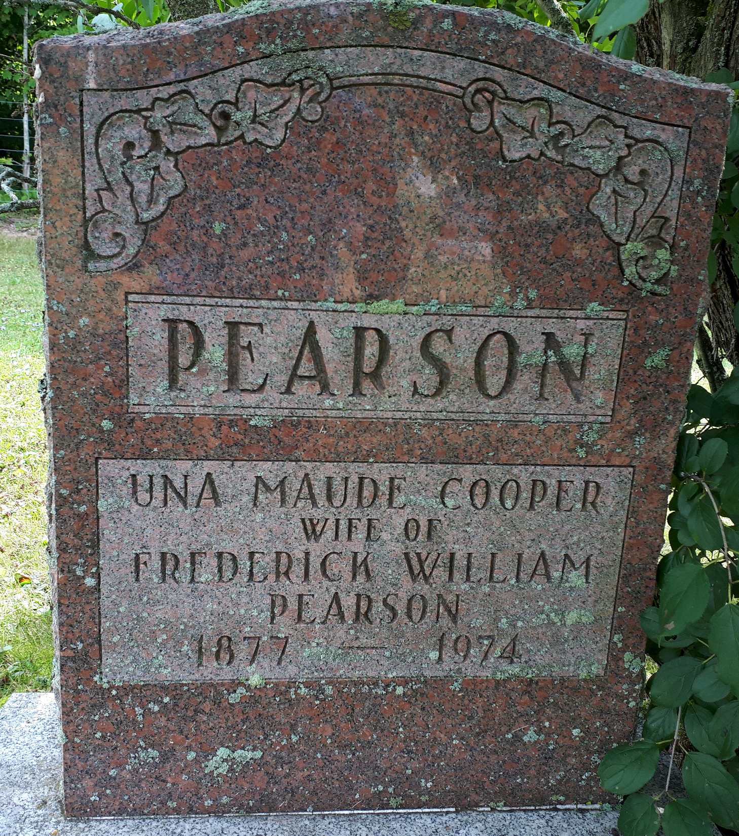 Una Maude Cooper was born in 1877 at Bow, London, England; per family tree of dougsly1 on ancestry.ca, Aug 14 2018.1 She married Frederick William Pearson on 12 August 1901 at Old Ford, London, England; per family tree of dougsly1 on ancestry.ca, Aug 14 2018.1 As of 12 August 1901,her married name was Pearson.1 Una Maude Cooper was buried in 1974 at Waite Cemetery, Cramahe Twp., Northumberland Co., Ontario; Memorial: (See Exhibit) PEARSON; Una Maude Cooper; Wife of; frederick William; Pearson; 1877 0 1974 (Waite Cemetery, Cramahe Twp., Aug 7 2018.)2 She died in 1974 at Northumberland Co., Ontario; per family tree of dougsly1 on ancestry.ca, Aug 14 2018.1