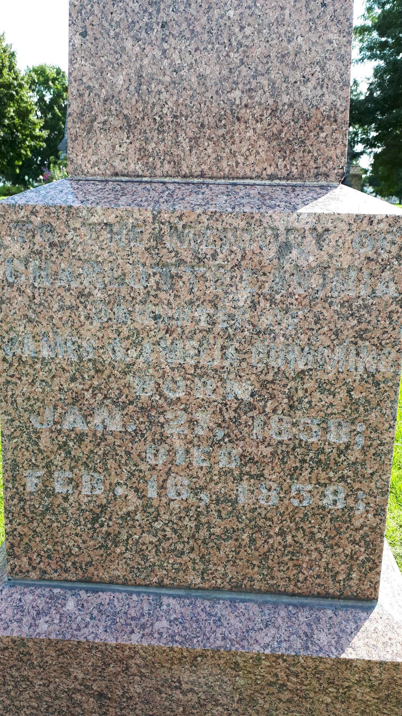 CemSearch: Name: Charlotte Lavinia Cumming; Born: Jan 27, 1858; Died: Feb. 16, 1858; Notes: One of the few remaining stones in St. George's Churchyard, dau. of James and Amelia Cumming, sibling Lavinia Mary Wragg Cumming; Other names: Cumming, James (1809-1873), Cumming, Lavinia "Mary" Wragg ( - 1876); Cemetery: St. George's Anglican Church, Trenton, Con A, Lot 7, Hastngs Co. - CHYD (http://www.cemsearch.ca/burial/?action=sameStoneGroup&selSameStoneChoice=394107.)1,2