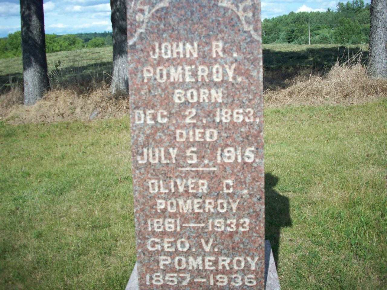 John Richard Pomeroy was born on 2 December 1863 at Cramahe Twp., Northumberland Co., Canada West; Date Dec 2 1863 per Memorial. Date 1864 & location Ont. per 1881 Census. Date 1864 & location Ont. per 1871 Census. Date Dec 2 1863 per family tree of oencentral on ancestry.ca, Sep 6 2018.1,4,5,3 He appeared on the census of April 1871 at Cramahe Twp., Northumberland East Co., Ontario; Age 7 at 1871 Census: see Wilkinson Pomeroy.5 He appeared on the census of April 1881 at Cramahe Twp., Northumberland East Co., Ontario; Age 17 at 1881 Census: see Wilkinson Pomeroy.1 He died on 5 July 1915 at Borden St., Toronto, York Co., Ontario, at age 51; Death Reg'n.#004321: Name: John Richard Pomeroy; Date: Jul 5 1915; Age: 51y; Place: ?N. ?Borden St., Toronto; Born: Cda; Occ.: farmer; Status: married; Parents: - & - ; Cause: cardiac failure; Phys.: A. H. Millar, 468 Church St; Inf.: A. W. Miles, 396 College St; Reg'd.: Jul 6 1915 (Ontario Death Registration, #004321-1915, ancestry.ca) Date July 5 1915 per Memorial. Date Jul 5 1915 per family tree of oencentral on ancestry.ca, Sep 6 2018.4,6,3 He was buried on 17 July 1915 at Castleton Cemetery, Castleton, Northumberland Co., Ontario; Memorial: (See Exhibit) John R; Pomeroy; Born; Dec. 2, 1863; Died; July 5, 1915; Oliver C; Pomeroy; 1861 - 1933; Geo. V; Pomeroy; 1857 - 1936 (Castleton Cemetery, Castleton, July 13 2009.)3