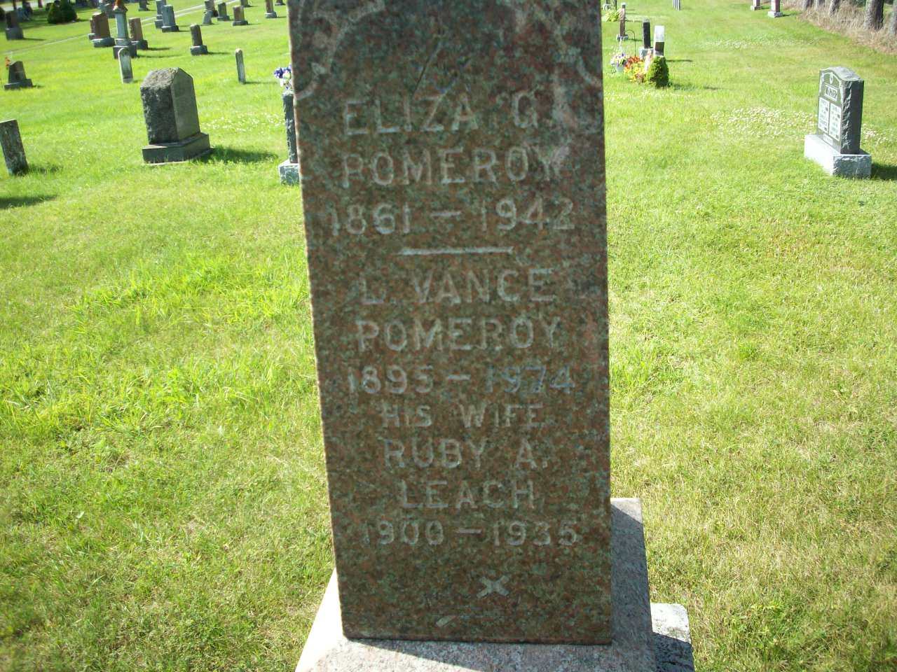 Eliza G. Pomeroy was born on 1 January 1861 at Cramahe Twp., Northumberland Co., Canada West; Date 1861 per Memorial. Date Jan 1861 & location Ont. per 1911 Census Date Jan 1 1860 & location Ont. rural per 1901 Census. Date 1861 & location Ont. per 1891 Census. Date 1860 & location Ont. per 1881 Census. Date 1860 & location Ont. per 1871 Census. Date 1859 & location UC per 1861 Census. Date Jan 1 1860 & location Ont. per family tree of oencentral on ancestry.ca, Sep 6 2018.1,2,5,6,3,7,8,9 She appeared on the census of April 1861 at Cramahe Twp., Northumberland Co., Canada West; Age 2 at 1861 Census: see George A. Pomeroy (grandfather.)5 She appeared on the census of April 1871 at Cramahe Twp., Northumberland East Co., Ontario; Age 11 at 1871 Census: see Wilkinson Pomeroy.3 She appeared on the census of April 1881 at Cramahe Twp., Northumberland East Co., Ontario; Age 21 at 1881 Census: see Wilkinson Pomeroy.1 She appeared on the census of 23 April 1891 at Cramahe Twp., Northumberland East Co., Ontario; Age 30 at 1891 Census: see Wilkinson Pomeroy.8 She appeared on the census of 11 April 1901 at Cramahe Twp., Castleton, Northumberland East Co., Ontario; Age 41 at 1901 Census: see Wilkinson Pomeroy.6 She appeared on the census of 7 June 1911 at Cramahe Twp, Northumberland East Co., Ontario; Age 50 at 1911 Census: see George V. Pomeroy (brother.)7 She appeared on the census of 7 June 1921 at Cramahe Twp., Castleton, Northumberland Co., Ontario; Age 61 at 1921 Census: see Oliver C. Pomeroy (brother.)4 She was buried in 1942 at Castleton Cemetery, Castleton, Northumberland Co., Ontario; Memorial: (See Exhibit) Eliza G; Pomeroy; 1861 - 1942; L. Vance; Pomeroy; 1895 - 1974; His Wife; Ruby A; Leach; 1900-1935 (Castleton Cemetery, Castleton, July 13 2009.)9 She died in 1942 at Ontario; Date 1942 per Memorial. Date 1942 per family tree of oencentral on ancestry.ca, Sep 6 2018.2,9