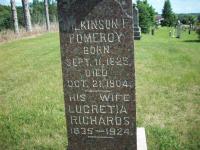 Lucretia Richards was born on 6 October 1835 at Bath, Lennox & Addington Co., Upper Canada; Date 1835 per Memorial. Date 1836 & location Ont. per 1921 Census. Date Oct 1835 & location Ont. per 1911 Census. Date Oct 6 1835 & location Ont. rural per 1901 Census. Date 1836 & location Ont. per 1891 Census. Date 1836 & location Ont. per 1881 Census. Date 1836 & location Ont. per 1871 Census. Date 1838 & location UC per 1861 Census. Date 1835 & location Cda. per 1851 Census. Location Bath, Ont. per Death Reg'n. of son Oliver Church Pomeroy. Date Oct 6 1835 & location Ont. per family tree of pencentral on ancestry.ca, Sep 6 2018.1,2,4,5,3,6,7,8,9,10,11 She appeared on the census of 1852 at Cramahe Twp., Northumberland Co., Canada West; Age 16 at 1851 Census: see John Richards.4 As of circa 1855,her married name was Pomeroy.1 She married Wilkinson F. Pomeroy, son of George A. Pomeroy and Rebecca Palmer, circa 1855 at Canada West.1 Lucretia Richards appeared on the census of April 1861 at Cramahe Twp., Northumberland Co., Canada West; Age 23 at 1861 Census: see George A. Pomeroy (father-in-law.)5 She appeared on the census of April 1871 at Cramahe Twp., Northumberland East Co., Ontario; Age 35 at 1871 Census: see Wilkinson Pomeroy.7 She appeared on the census of April 1881 at Cramahe Twp., Northumberland East Co., Ontario; age 45 at 1881 Census: see Wilkinson Pomeroy.1 She appeared on the census of 23 April 1891 at Cramahe Twp., Northumberland East Co., Ontario; Age 55 at 1891 Cesus: see Wilkinson Pomeroy.11 She appeared on the census of 11 April 1901 at Cramahe Twp., Castleton, Northumberland East Co., Ontario; Age 65 at 1901 Census: see Wilkinson Pomeroy.6 She appeared on the census of 7 June 1911 at Cramahe Twp., Northumberland East Co., Ontario; Age 75 at 1911 Census: see George V. Pomeroy (son.)10 She appeared on the census of 7 June 1921 at Cramahe Twp., Castleton, Northumberland Co., Ontario; Age 85 at 1921 Census: see Oliver C. Pomeroy (son.)9 She died in 1924 at Ontario; Date 1924 per Memorial. Date 1924 per family tree of pencentral on ancestry.ca, Sep 6 2018.2,3 She was buried in 1924 at Castleton Cemetery, Castleton, Northumberland Co., Ontario; Memorial: (See Exhibit) Wilkinson F; Pomeroy; Born; Sept. 11, 1825; Died; Oct. 21, 1904; His Wife; Lucretia; Richards; 1835 - 1924 (Castleton Cemetery, Jul 13 2009.)3