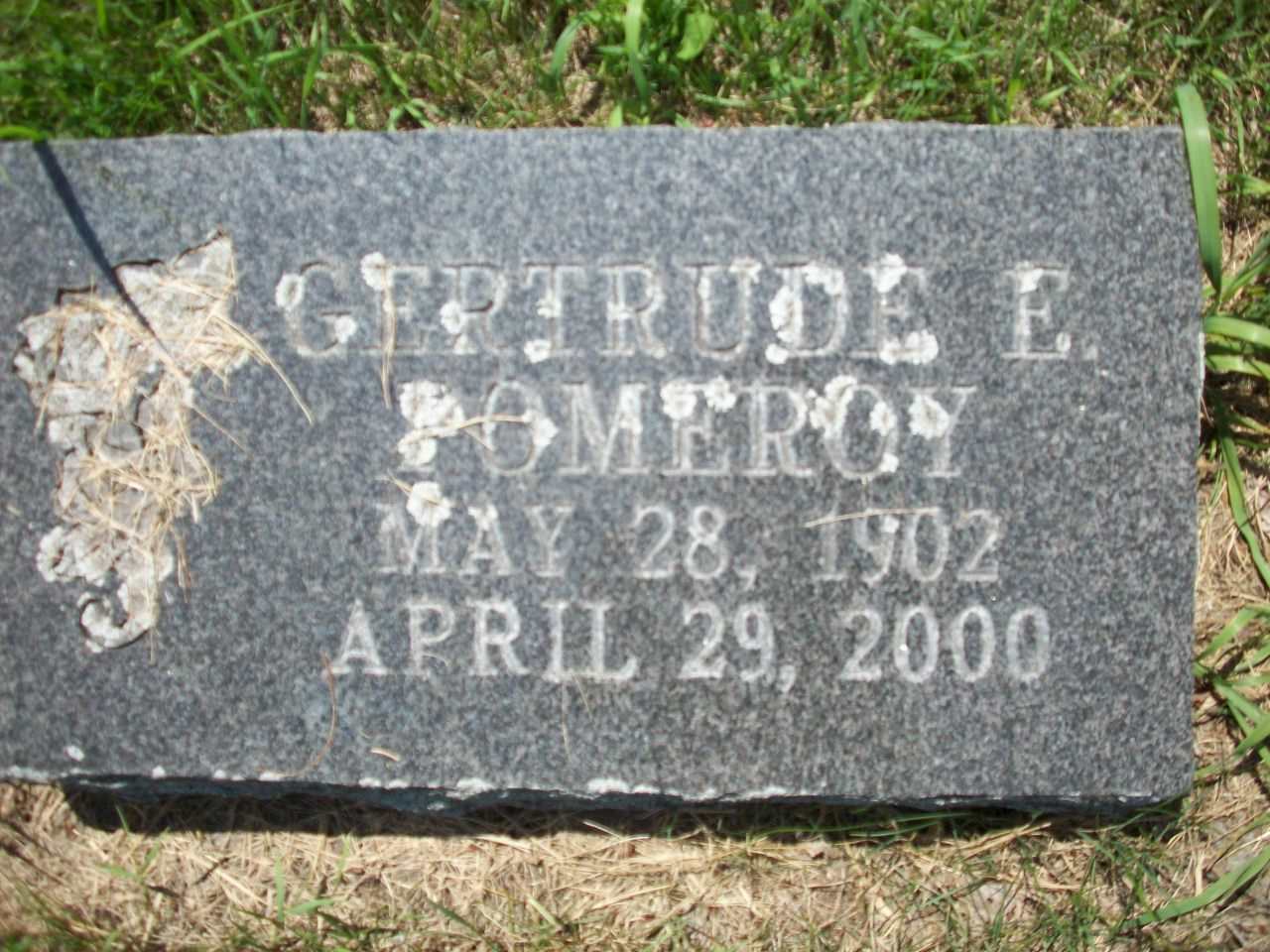 CemSearch: Name: Gertude Essie Pomeroy; Born: May 28, 1902; Died: Apr 29, 2000; Notes: Dau. of John B. Pomeroy & Georgina White, siblings Nellie Rebecca, helen, Marjorie, Clayton, Robert & Hubert Pomeroy, Marjorie [McNutt] & Helen [Lovless], Cremated & ashes buried here, Death per obit records; Cemetery: Castleton Cemetery, Castleton, Sec A-S Row 7 Plot 7 (http://www.cemsearch.ca/burial/?action=selectionList&choiceBurialID=83496#.)3,7