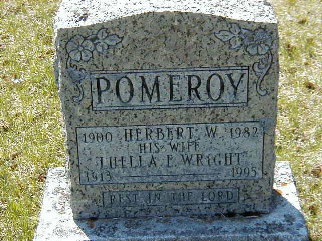 William Herbert Pomeroy was born on 15 June 1900 at Cramahe Twp., Castleton, Northumberland Co., Ontario; Birth Reg'n.#... : Name: Wm. Herbert Pomeroy; Date: June 15 1900; Parents: John B. Pomeroy & Georgina White... pg. 2 n/a .. (Ontario Birth Registration, #..., ancestry.ca) Date 1900 per Memorial. Date 1901 & location Ont. per 1921 Census. Date June 1901 & location Ont. per 1911 Census. Date June 15 1900 & location Ont. rural per 1901 Census.1,2,4,5,6 He appeared on the census of 8 April 1901 at Cramahe Twp., Castleton, Northumberland East Co., Ontario; Age - at 1901 Census: see John B. Pomeroy.1 He appeared on the census of 1911 at Cramahe Twp., Northumberland East Co., Ontario; Age 10 at 1911 Census: see John B. Pomeroy.2 He appeared on the census of 9 June 1921 at Cramahe Twp., Castleton, Northumberland Co., Ontario; Age 20 at 191 Census: see John Pomeroy.4 He married Luella E. Wright circa 1940; per Memorial.6 William Herbert Pomeroy was buried in 1982 at Castleton Cemetery, Castleton, Northumberland Co., Ontario; Memorial: (See Exhibit) POMEROY; 1900 Herbert W. 1982; His Wife; Luella E. Wright; 1913 - 1995 (Castleton Cemetery, Castleton.)6 He died in 1982; Date 1982 per Memorial.6