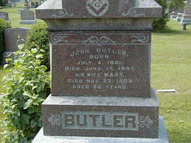 CemSearch: Name: John Butler; Born: Jul 4 1821; Died: Jun 17 1897; ID: MTHOPE71; Other names: Butler, Ida A. (1866-1927), Butler, Mary [Norborough]( - 1909), Butler, Robert (1846-1863); Cemetery: Mount Hope Cemetery, Brighton, Sec 1 row 5 (https://www.cemsearch.ca/burial/?pid=MTHOPE71%5E0.)3,4