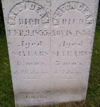 Note: Weston Dean is with Joel Dean, Sr., in Wilbraham in 1800 but not in 1810. He came to UC before his father or brothers, JoelJr. and Benjamin.3 He appeared on the census of May 1804 at Hamilton Twp., Northumberland Co., Upper Canada; 1804 Census: Weston Dean; 1 male 16 to 60; 1 female 16 to 60; 1 male under 16; 1 female under 16 (1804 Census: Hamilton Twp., Northumberland Co, Upper Canada.) He appeared on the census of 1805 at Hamilton Twp., Northumberland Co., Upper Canada; 1805 Census: Weston Dean; 1 male 16 to 60; 1 female 16 to 60; 1 male under 16; 1 female under 16 (1805 Census: Hamilton Twp., Northumberland Co, Upper Canada.) He died on 18 November 1854 at Hamilton Twp., Northumberland Co., Canada West, at age 81; Date Nov 18 1854 per Memorial. per family tree of frswift on ancestry.ca, Jan 7 2019.1,2 He was buried on 20 November 1854 at Hull's Corners Cemetery, Hamilton Twp., Northumberland Co., Ontario; Memorial: (See Exhibit) Salley Dean; Died; Feb. 3, 1855; Aged; 84 Years; 6 Months; & 16 days; Weston Dean; Died; Nov. 18 854; Aged; 81 Years; 5 Months; & 3 days (Hull's Corners Cemetery, Jun 9 2011, by Dan.)2