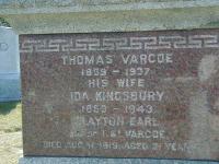 CemSearch: Name: Thomas Varcoe; Born: 1859; Died: 1937; ID: CAMPMP!2992; Other names: Varcoe, Clayton Earl ( - 1919), Varce, Ida [Kingsbury](1869-1943); Cemetery: Mount Pleasant Cemetery, Campbellford (http://www.cemsearch.ca/burial/?action=sameStoneGroup&selSameStoneChoice=CAMPMP%212992.)1,2,6