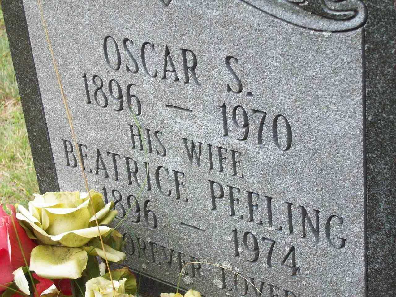 Oscar Saunders Kenney was born on 6 June 1896 at Brighton Twp., Northumberland Co., Ontario; Date 1895 & location Brighton Twp. per marriage reg'n. Date Jun 6 1896 & location Brighton per family tree of 1_dnewman57 on ancestry.ca, March 25 2019.1,2 He lived on 20 January 1916 at Brighton Twp., Northumberland Co., Ontario; Residence Brighton Twp. per marriage reg'n.2 He married Evelyn Beatrice Peeling, daughter of William Peeling and Emrilla Anderson, on 20 January 1916 at Hilton, Northumberland Co., Ontario; Marriage Reg'n.#015871: Groom: Oscar Sandrus Kenney; Age: 20; Res. & Born: Brighton Twp; Status: bachelor; Occ.: farmer; Rel.: Meth; Parents: Charles Kenney & Ada Fulford; Bride: Evelyn Beatrice Peeling; Age: 19; Res.: Codrngton, Ont; Born: Michigan, USA; Status: spinster; Rel.: Meth; Parents: William Peeling & Emrilla Anderson; Wit.: Miss Alice Withers, Hilton & Evertt Isaac McNutt?, Morganston, Ont; Date: Jan 20 1916; Place: Hilton; Performed by: Rev. Robert stricker, Hilton, Meth; Sworn: Brighton, Jan 24 1916; Reg'r.: G. A. Thorne, Brigton Twp. (Ontario Marriage Registration, #015871-1916, ancestry.ca.)4 Oscar Saunders Kenney lived on 7 June 1933 at Brighton Twp., Northumberland Co., Ontario; Informant for Death Reg'n. of his father Charles M. Kenney.5 He was buried in 1970 at Woods Cemetery, Cramahe Twp., Northumberland Co., Ontario; Memorial: (See Exhibit) Oscar S; 1896 - 1970; His Wife; Beatrice Peeling; 1896 - 1974 (Woods Cemetery, Cramahe Twp., July 6 2009.)3 He died in 1970 at Ontario; Date 1970 per Memorial. Date 1970 per family tree of 1_dnewman57 on ancestry.ca, March 25 2019.1,3