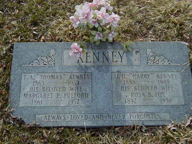 In the winter of 1940 heavy snow caused the roof to collapse and the building was tom down and never replaced. A private home occupies the site today but a bit of the old pavilion foundation can still be seen." from Summer Dance Pabilions, J. f. Delong, pg. 62. in 1930 at Spring Valley Pavilion, Spring Valley, Northumberland Co., Ontario. He Last Worked - per Death Reg'n. on 18 July 1936 at Brighton Twp., Northumberland Co., Ontario.1 He died on 15 September 1939 at Conc 2 Lot 1, Brighton Twp., Northumberland Co., Ontario, at age 76; Death Reg'n.#026208: Name: Thomas Alvin Kenney; Date: Sep 15 1939; Age: 77y 3m 22d; Res.: Conc 2, Lot 1, Brighton Twp., lifetime; Born: Brighton, May 24 1862; Status: married; Nat.: Irish; Occ.: labourer, reited - last worked July 18 1936; Parents: John Kinney & Emily Jones, b. Ireland; Inf.: Harry Kenney, Brighton, son; Burial: Woods Cemetery, Cramahe Tw., Sep 16 1939; Und.: B. E. Brintnell, Brighton; cause: cerebral haemourhage; Phys.: H. b. Rourke, Brighton; Reg'd.: Sep 16 1939; Reg;r.: Fred O. Wade, Brighton Twp. (Ontario Death Registration, #026208-1939, ancestry.ca) Date 1939 per Memorial.7,4 He was buried on 16 September 1939 at Woods Cemetery, Cramahe Twp., Northumberland Co., Ontario; Memorial: (See Exhibit) KINNEY; T. A. "Thomas" Kenney; 1863 - 1939; His Beloved Wife; Margaret P. Fulford; 1861 - 1952; J. H. "Harry" Kenney; 1888 - 1949; His Beloved Wife; Rosa B. Fox; 1892 - 1939 (Woods Cemetery, Cramahe Twp., Apr 2 2006) Per Death Reg'n.1,4