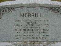 CemSearch: Name: Samantha Merrill; Maiden: Wait; Born: 1802; Died: Nov 20 1872; Age: 70; ID: FAIRVWE064; Other names: Benedict, Emily [Merrill](1845-1878), Ewing, Alice H. [Merrill](1840-1872), Merrill, John (1800-1879); Cemetery: Fairview Cemetery, Conc 1 Lot 19, Haldimand Twp. (Grafton), EAST (https://www.cemsearch.ca/burial/?pID=FAIRVWE064%5E1.)1,4