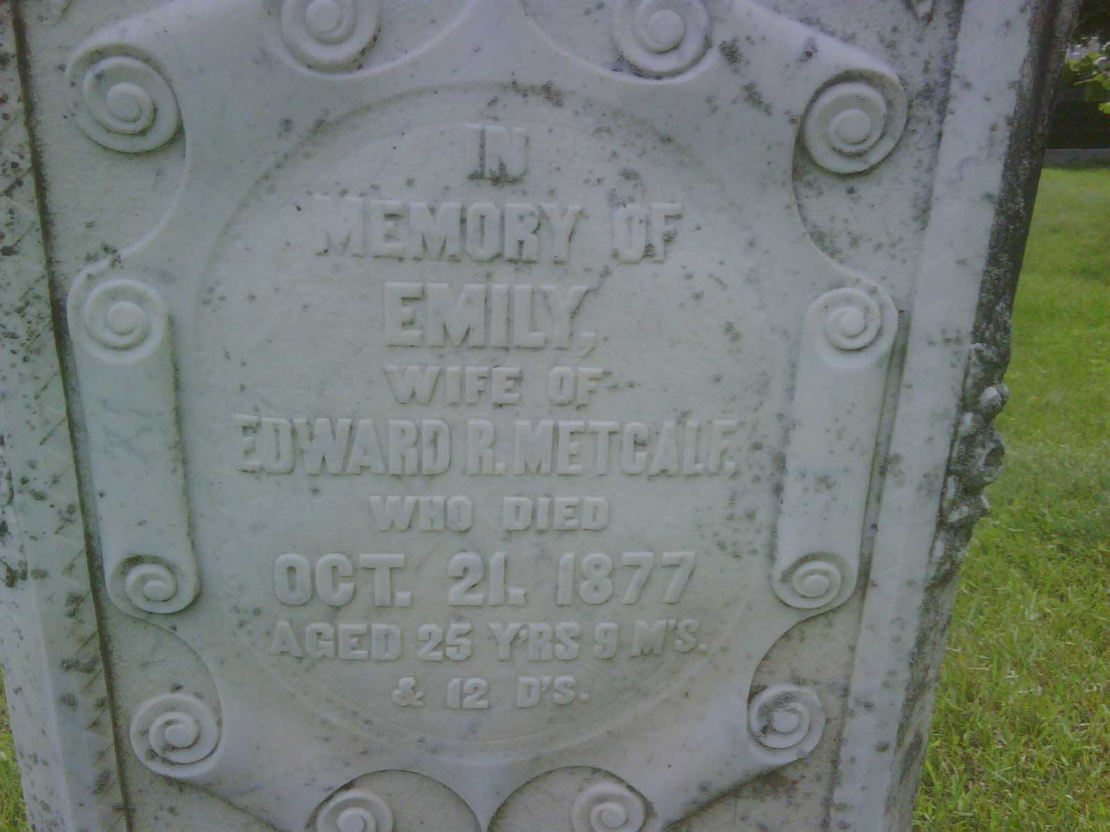 Emily Dulmage was born on 9 January 1852 at Canada West; Date Jan 9 1852 per Memorial - age 25y 9m 12d at death Oct 21 1877.1 As of circa 1872,her married name was Metcalfe.1 She married Edward R. Metcalf, son of John Metcalf and Eliza L. Ackerman, circa 1872 at Ontario.1 Emily Dulmage died on 21 October 1877 at Ontario at age 25; Date Oct 21 1877 per Memorial.1 She was buried on 23 October 1877 at Salem Cemetery, Cramahe Twp., Salem, Northumberland Co., Ontario; Memorial: (See Exhibit) In; Memory of; Emily; Wife of; Edward R. Metcalf; Who Died; Oct. 21, 1877; Aged 25 Y'rs 9 M's; & 12 D's (Salem Cemetery, Cramahe Twp., July 4, 2009.)1