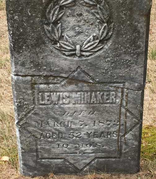 FindaGrave: Name: Lewis Minaker, Jr; Birth: 19 May 1819, Ontario, Canada; Death: 7 Mar 1872 (aged 52), Ontario, Canada; Burial: Rose Cemetery, Waupoos, Prince Edward County, Ontario; Memorial ID: 142728037 (https://www.findagrave.com/memorial/142728037.)6,7