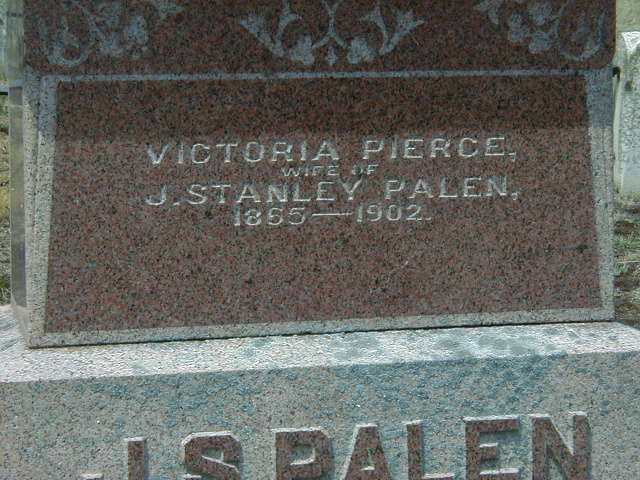 FindaGrave: Name: Victoria Pierce Palen; Birth: 1865; Death: 1902 (aged 36–37); Burial: Saint John's Anglican Cemetery, Waupoos East, Prince Edward County, Ontario; Memorial ID: 115492289 (https://www.findagrave.com/memorial/115492289.)3,5