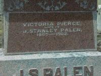 Victoria Pierce was born on 29 November 1865 at North Marysburgh Twp., Prince Edward Co., Canada West; Date 1865 per FindaGrave. Date 1865 & location Ont. per 1871 Census. Date Nov 29 1865 & location North Marysburgh per family tree of JRS06002 on ancestry.ca, Jan 24 2020.1,2,3 She appeared on the census of April 1871 at North Marysburgh Twp., Prince Edward Co., Ontario; Age 6 at 1871 Census: see John Pierce.2 As of 3 January 1894,her married name was Palen.1 She married John Stanley Palen, son of Lewis Palen and Sarah Pierce, on 3 January 1894 at St. John's Church, Waupoos, Prince Edward Co., Ontario; Marriage Reg'n.#010455: Groom: John Stanley Palen; Age: 29; Res. & Born: North Marysburgh Twp; Status; bachelor; Occ.: mariner; Parents: Lewis & Sarah Palen; Bride: Victoria Pierce; Age: 29; Res. & Born: North Marysburgh Twp; Status: spinster; Parents: John & Lydia Pierce; Wit.: Ardne Wright & Luella Palen, Waupoos; Date: Jan 3 1894; Place: St. John's Church, Waupoos; Rel.: CE; Performed by: R. J. Fairburn; Reg'r.: J. W. Harrison, North Marysburgh Twp. (Ontario Marriage Registration, #010455-1894, ancestry.ca)