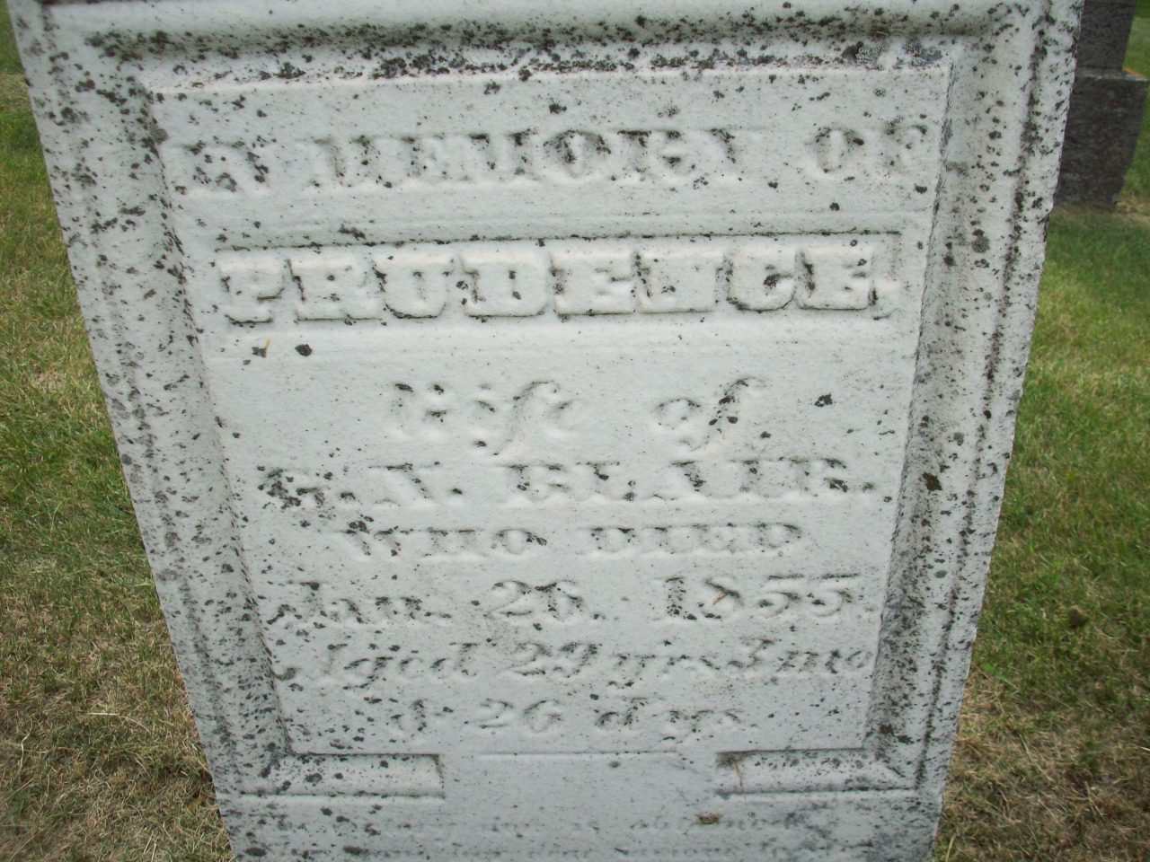 Prudence Wells was born on 30 September 1825 at Upper Canada; Date Sep 30 1825 per Memorial - age 29y 3m 26d at death Jan 26 1855. Date Oct 1 1826 per CemSearch. Date 1825 & location Cda. per 1851 Census.1,2,3 As of circa 1846,her married name was Blair.1 She married George Nelson Blair, son of David Blair Sr. and Anna Stanton, circa 1846 at Percy Twp., Northumberland Co., Canada West; per Walter Blair born Nov 14 1847.1,2 Prudence Wells appeared on the census of 1851 at Percy Twp., Northumberland Co., Canada West; Age 26 at 1851 Census: see George N. Blair.3 She died on 26 January 1855 at Percy Twp., Northumberland Co., Canada West, at age 29; Date Jan 26 1855 per CemSearch.1 She was buried on 28 January 1855 at Stone's Cemetery, Percy Twp., Northumberland Co., Canada West; Memorial: (See Exhibit) In Memory of; Prudence; Wife of; G. N. Blair; Who Died; Jan 26 1855; Aged 29 y'rs, 3 mo; & 26 d'ys (Stone's Cemetery, Percy Twp., July 15 2009, by Dan)