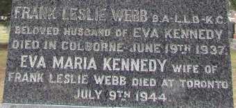 Eva Maria Kennedy was born in 1866 at Toronto, York Co., Canada West; Date 1866 & location Toronto per marr. reg'n.1 She lived on 23 December 1895 at Toronto, York Co., Ontario; Residence Toronto per marr. reg'n.1 As of 23 December 1895,her married name was Webb.1 She married Frank Leslie Webb, son of George Washington Webb and Ann Alida Keller, on 23 December 1895 at Toronto, York Co., Ontario; Marriage Reg'n.#015303: Groom: Frank Leslie Webb; Age: 32; Res.: Colborne; Born: Cda; Status: bachelor; Occ.: Barrister at law; Parents: George Washington & Ann Alida Webb; Bride: Eva Maria Kennedy; Age: 29; Res. & Born: Toronto; Status: spinster; Parents: Warring & Jane Kennedy; Wit.: David Holy & Madeline Walker; Date: Dec 23 1895; Place: Toronto; Rel.: Meth; Performed by: John Potts (Ontario Marriage Registration, #015303-1895, ancestry.ca.)2 Eva Maria Kennedy died on 19 July 1944 at Toronto, York Co., Ontario; Date July 19 1944 & location Toronto per Memorial.3 She was buried on 22 July 1944 at Mount Pleasant Cemetery, Toronto, York Co., Ontario; Memorial: ( See Exhibit) Frank Leslie Webb B.A.-L.L.B-K.C; Beloved Husband of Eva Kennedy; Died in Colborne June 19th 1937; Eva Maria Kennedy wife of; Frank Leslie Webb died at Toronto; July 19 1944 (Mout Pleasant Cemetery, Toronto, image from FindaGrave.)3
