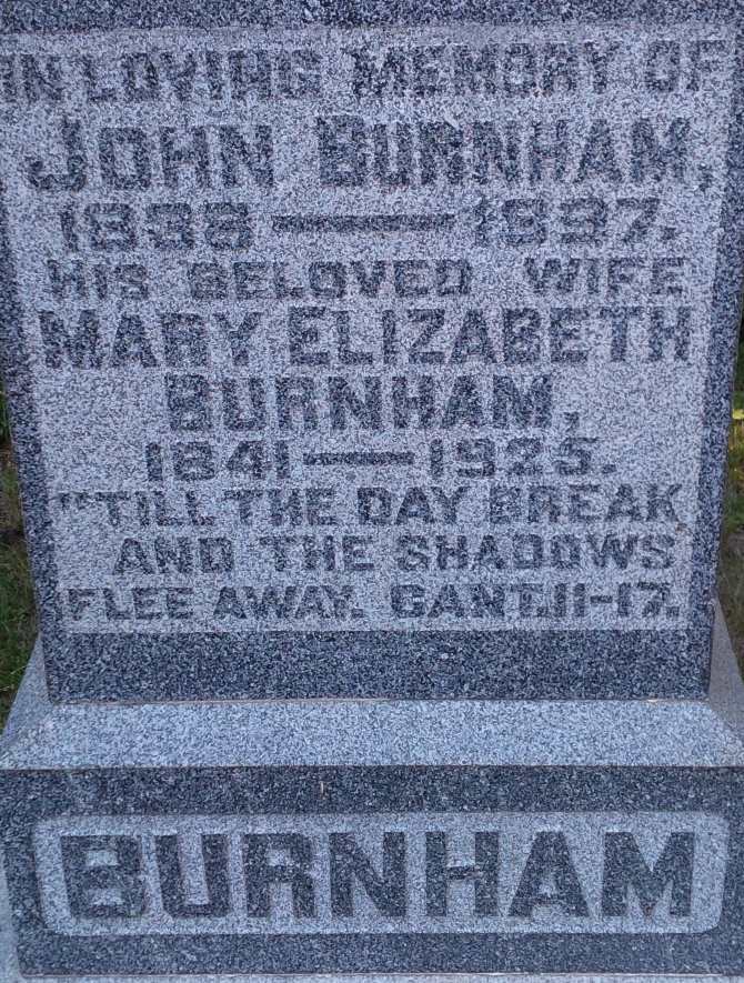 CemSearch: Name: Mary Elizabeth Burnham; Born: 1841; Died: 1925; ID: CBSPCM0056; Other names: Burnham, James Cecil (1873-1873), Burnham, John (1838-1897), Burnham, Mary Ursula (1880-1881); Cemetery: St. Peter's Anglican Church Cemetery, Ontario S. N., Cobourg, Plot 2225 (https://www.cemsearch.ca/burial/?pid=CBSPCM0056%5E1.)2,6