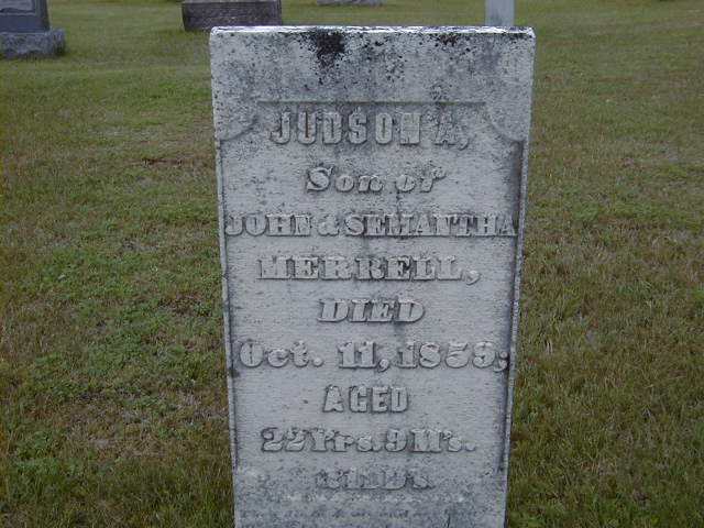 Judson A. Merrill was born on 30 December 1836 at Haldimand Twp., Northumberland Co., Upper Canada; Date Dec 30 1836 per Memorial - age 22y 9m 11d at death Oct 11 1859.1 He died on 11 October 1859 at Haldimand Twp., Northumberland Co., Canada West, at age 22; Date Oct 11 1859 per Memorial.1 He was buried on 13 October 1859 at Fairview Cemetery, Haldimand Twp., Northumberland Co., Canada West; Memorial: (See Exhibit) Judson A; Son of; John & Semantha; Merrell; Died; Oct. 11, 1859; Aged; 11 Yrs., 9 M's; & 11 D's (Fairview Cemetery, Grafton, July 9 2004, by Dan.)1
